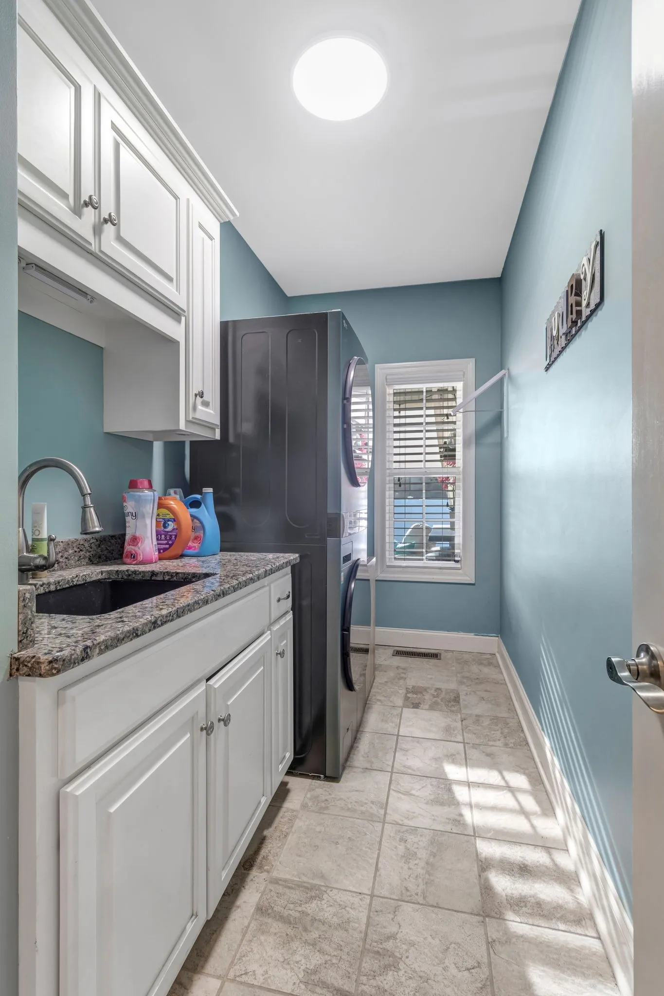 Utility room with granite counter, sink & cabinets