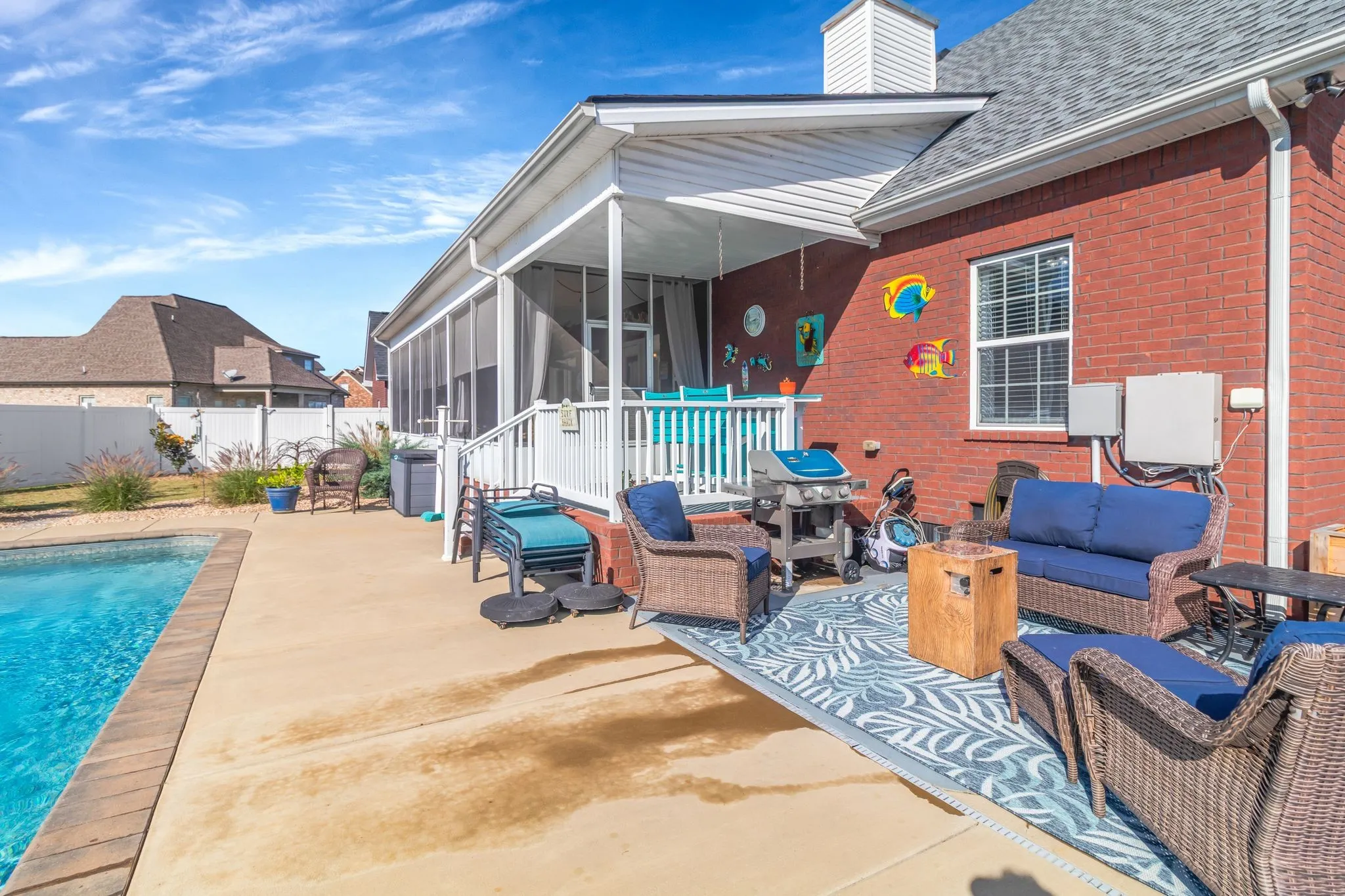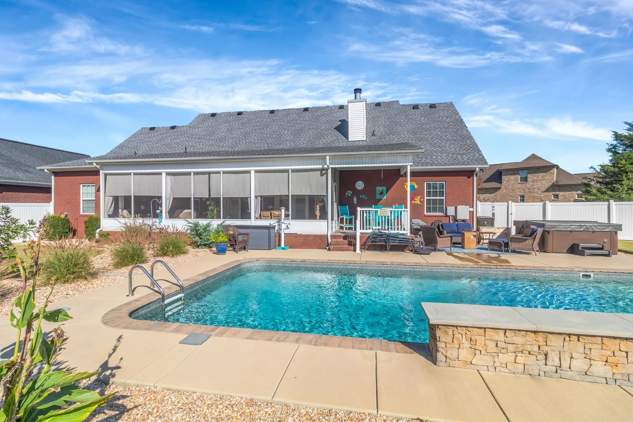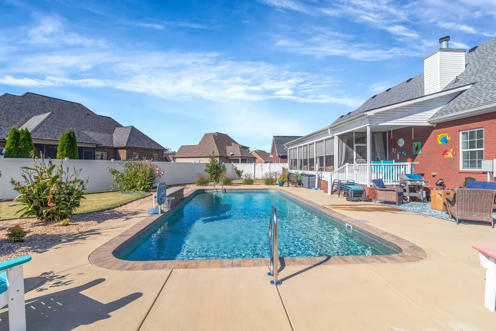 Enjoy the screened porch overlooking a large, fenced-in backyard with a 16×36 saltwater heated pool (installed 3 years ago) featuring coping all around, a three-tier waterfall with color-changing lights.