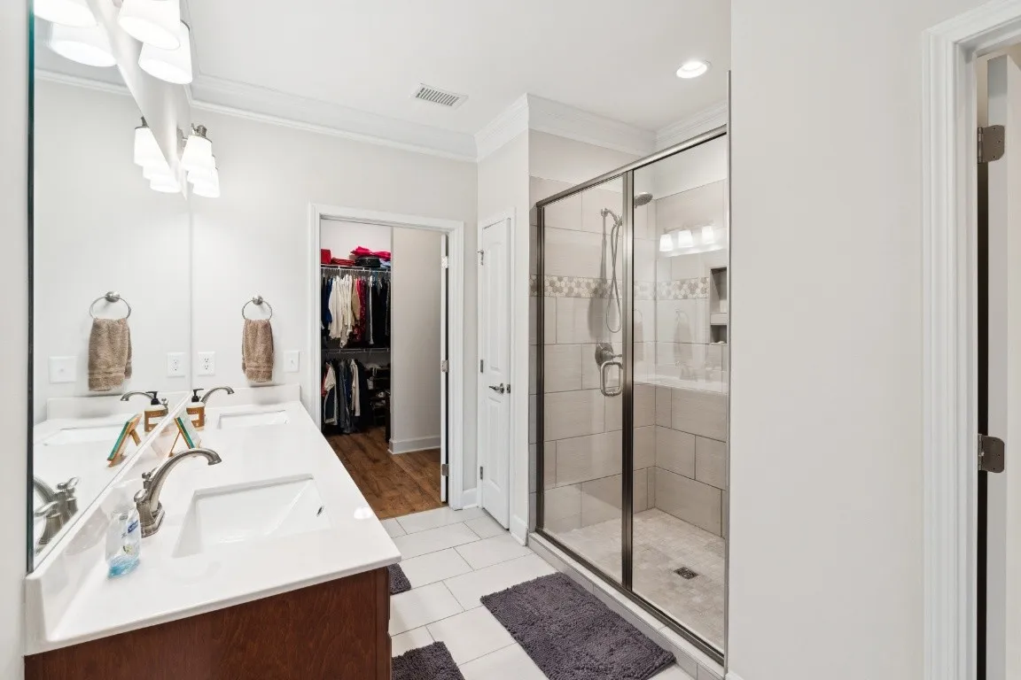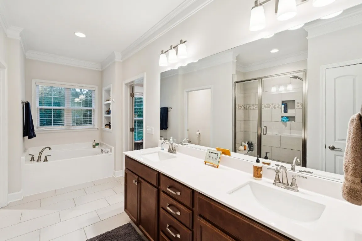 The main level features three bedrooms—or two bedrooms and a dedicated office—giving you flexibility to suit your lifestyle. The primary suite is a true retreat, complete with a generous walk-in closet, relaxing soaker tub, a walk-in shower with a bench seat, and a dual vanity for effortless mornings.