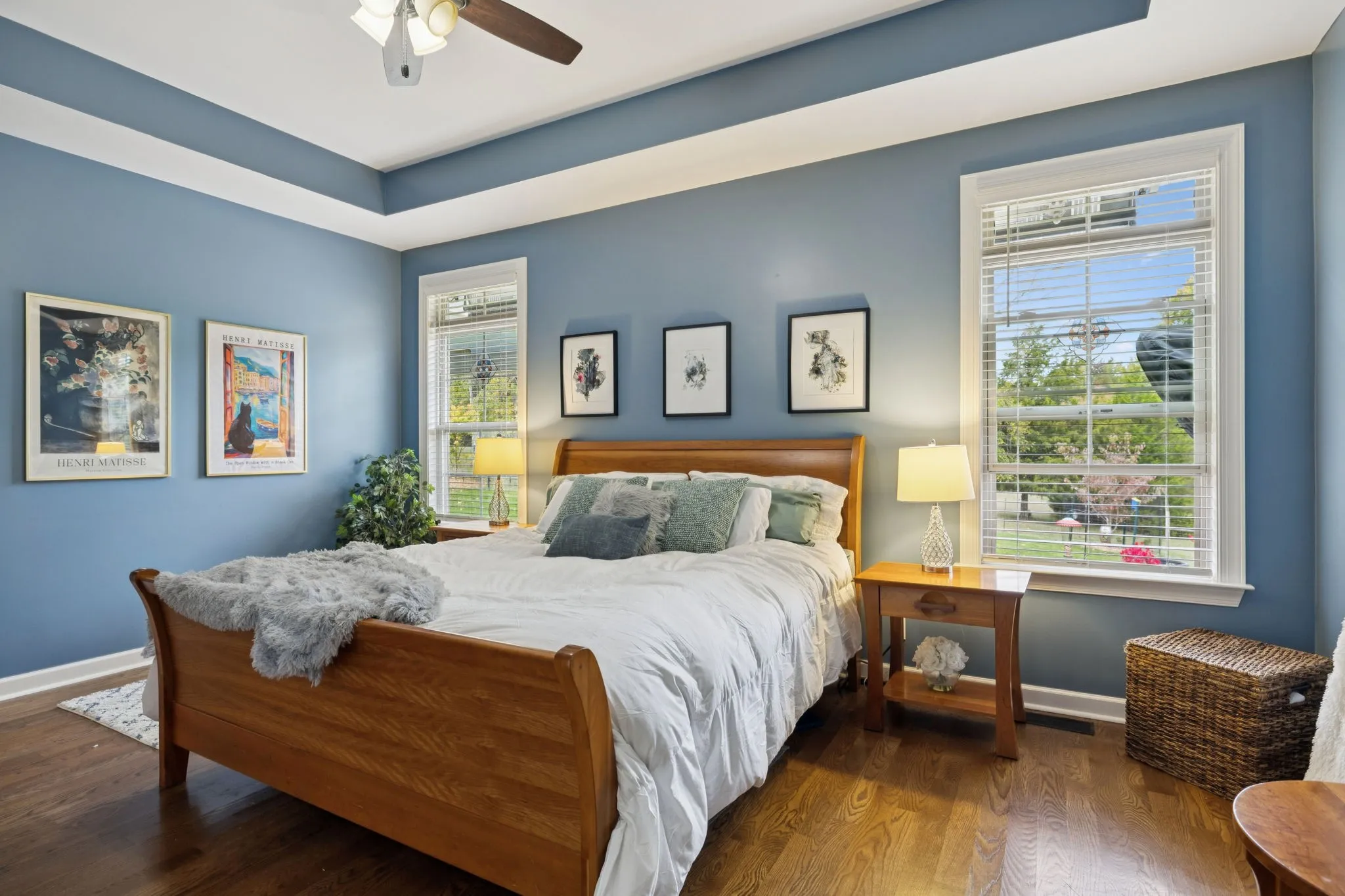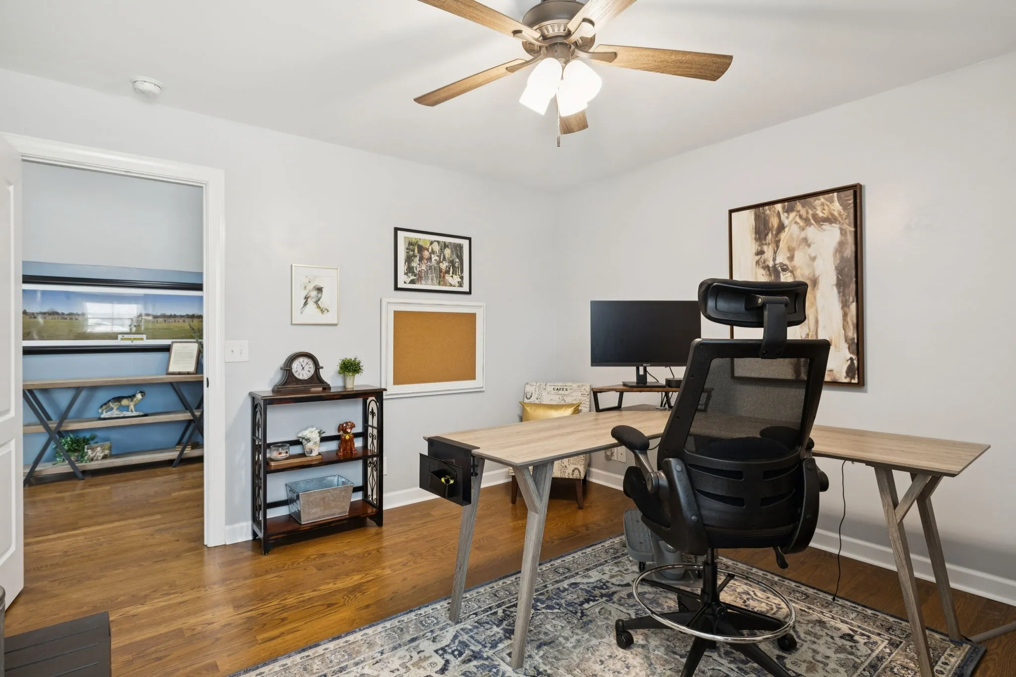 The backyard provides open farmland views where deer are often seen. Enjoy evenings by the firepit or relax on the expanded covered patio with rolling shade screen.