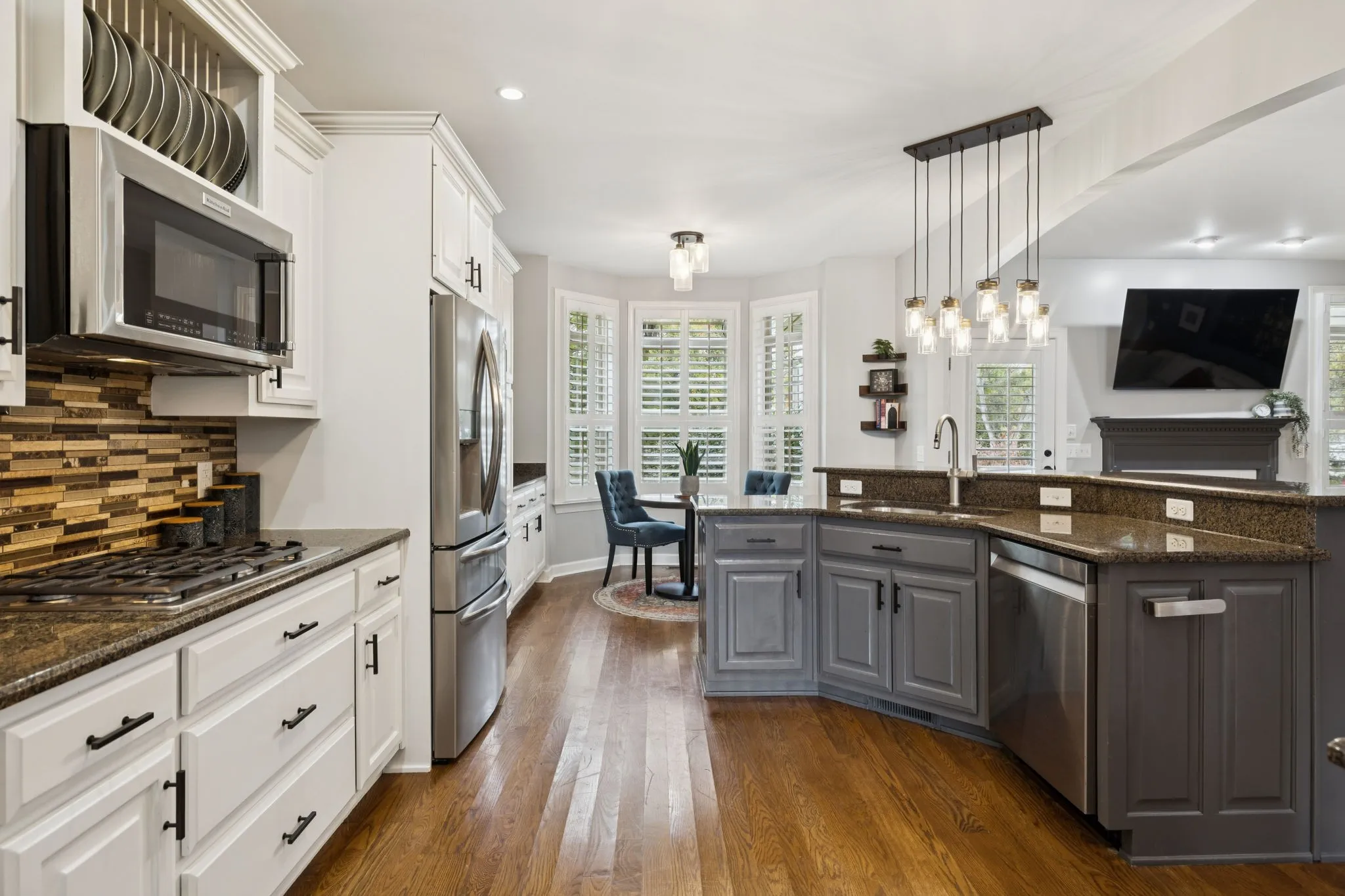 The kitchen features white cabinetry, granite countertops, stainless steel appliances, a breakfast bar, buffet and coffee station, bay-window dining, pantry, and double ovens. Large laundry with drop zone & W/D remain