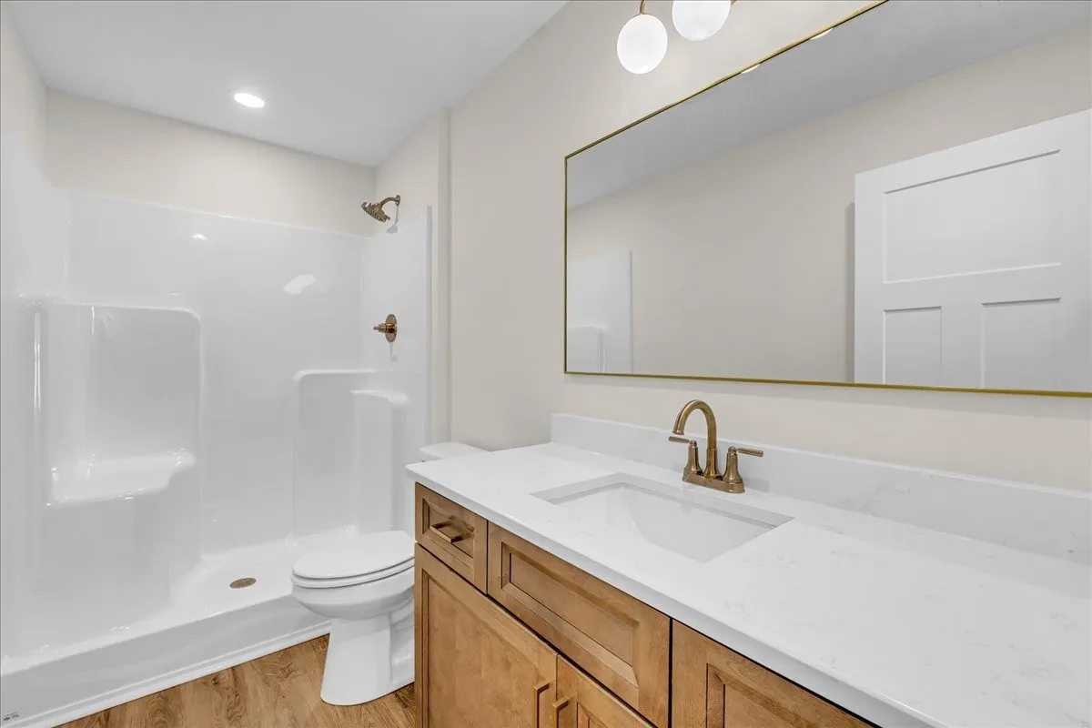 Step inside to find vaulted ceilings that create an open, airy feel. The kitchen and bathrooms feature sleek quartz countertops, white subway tile backsplash, modern two-tone cabinets, and elegant gold hardware for a touch of luxury. The primary suite includes a private shower, offering a comfortable retreat.