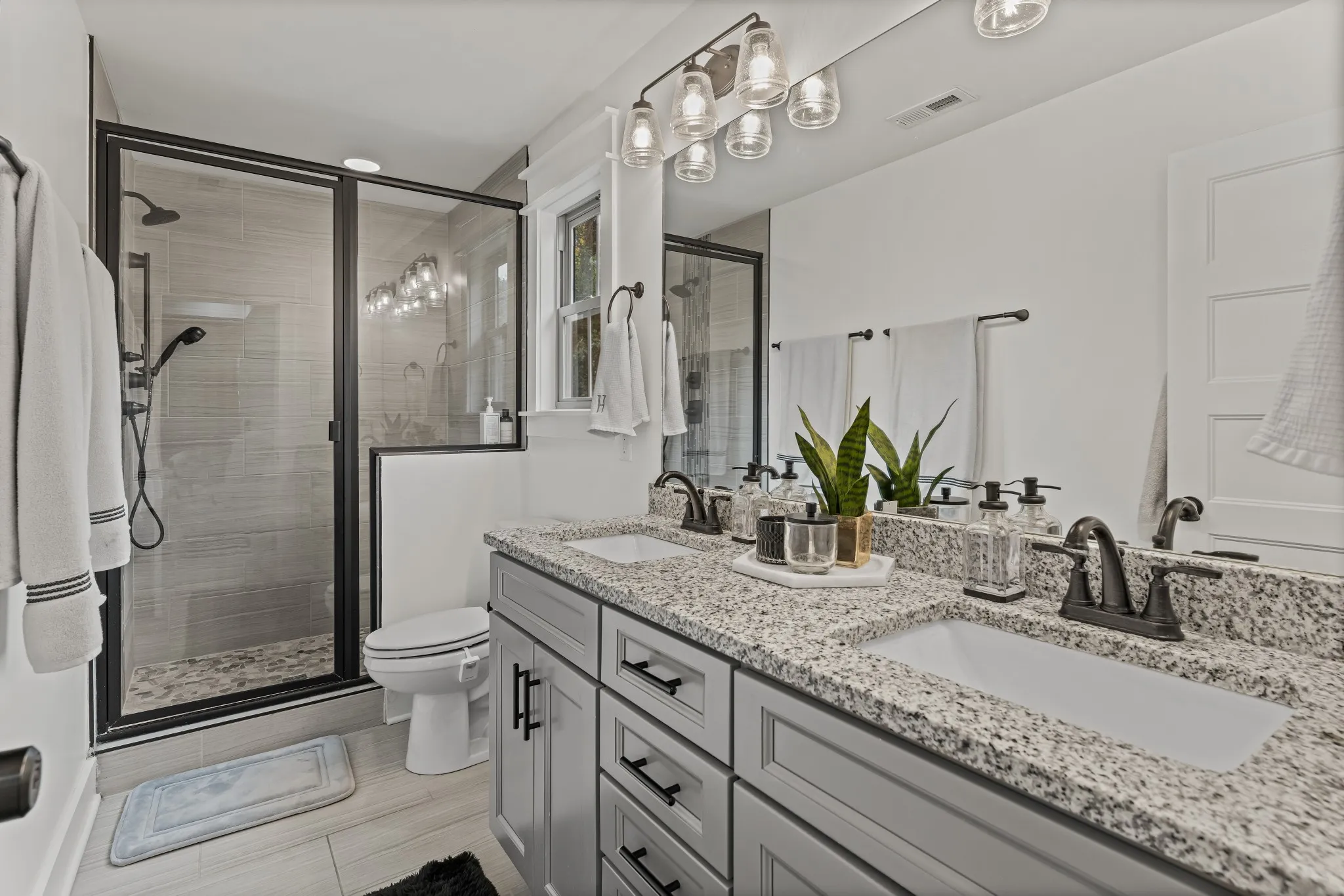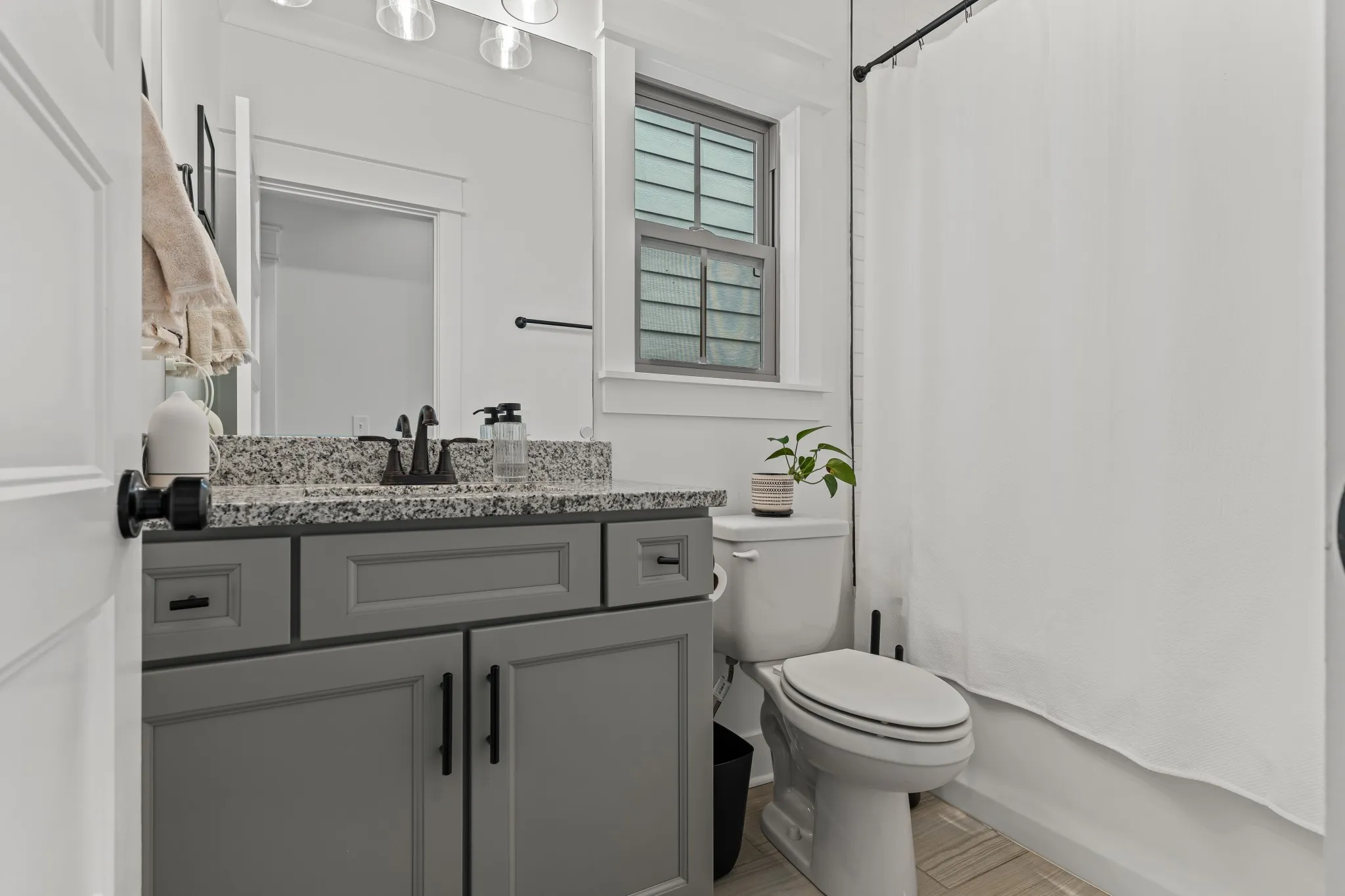 Motivated Sellers! No HOA. Make us an offer! This immaculate move in ready home features 2 en-suite bedrooms upstairs, and a third bedroom with access to a full bathroom on the main level while enjoying a covered patio, private fenced backyard with TV to convey and beautiful mature trees as your scenery. Inside this home features an open-concept layout, designer lighting, white cabinetry with granite countertops, warm wood floors, and sleek black fixtures. Custom blinds throughout, beautiful new carpet upstairs and a premium blackout treatment in one bedroom. Murphy bed included in main level bedroom. This layout is ideal for guests, multigenerational living or a home office. No flood insurance required. Available for a quick closing-schedule your showing today.