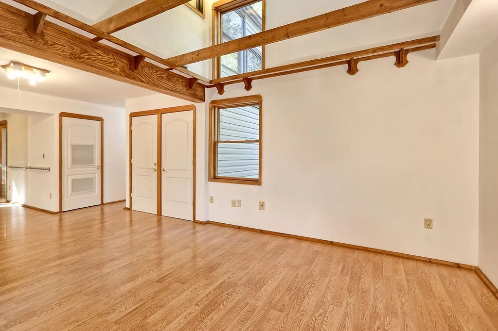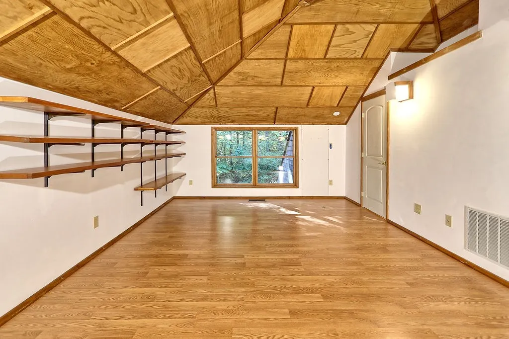From the elevated main deck—partially covered and partially open—you’ll enjoy a skyline view of the treetops and surrounding landscape. Inside, the home embodies a 1970s aesthetic with a bright, open-concept layout that’s perfect for entertaining. Guests enter through a beam-accented den that flows easily into the kitchen, dining, and office areas.