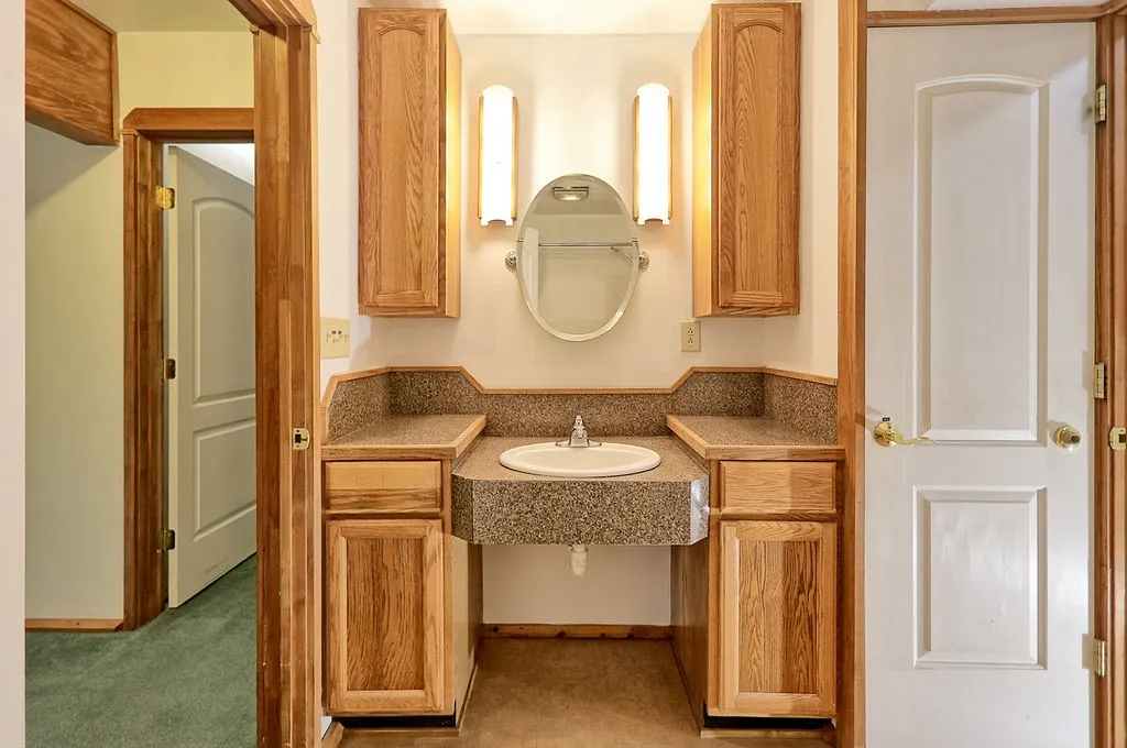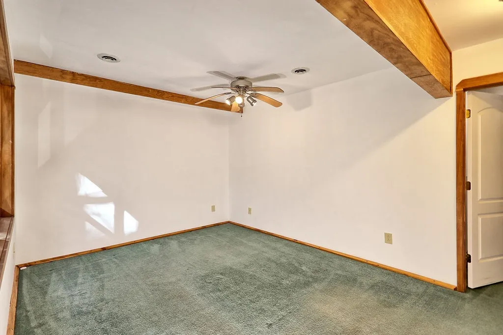 Freshly painted and well-maintained, the main level features two bedrooms with a shared, handicap-accessible bath. Upstairs, a third bedroom or bonus room includes built-in shelving, another full bath, and additional storage space.