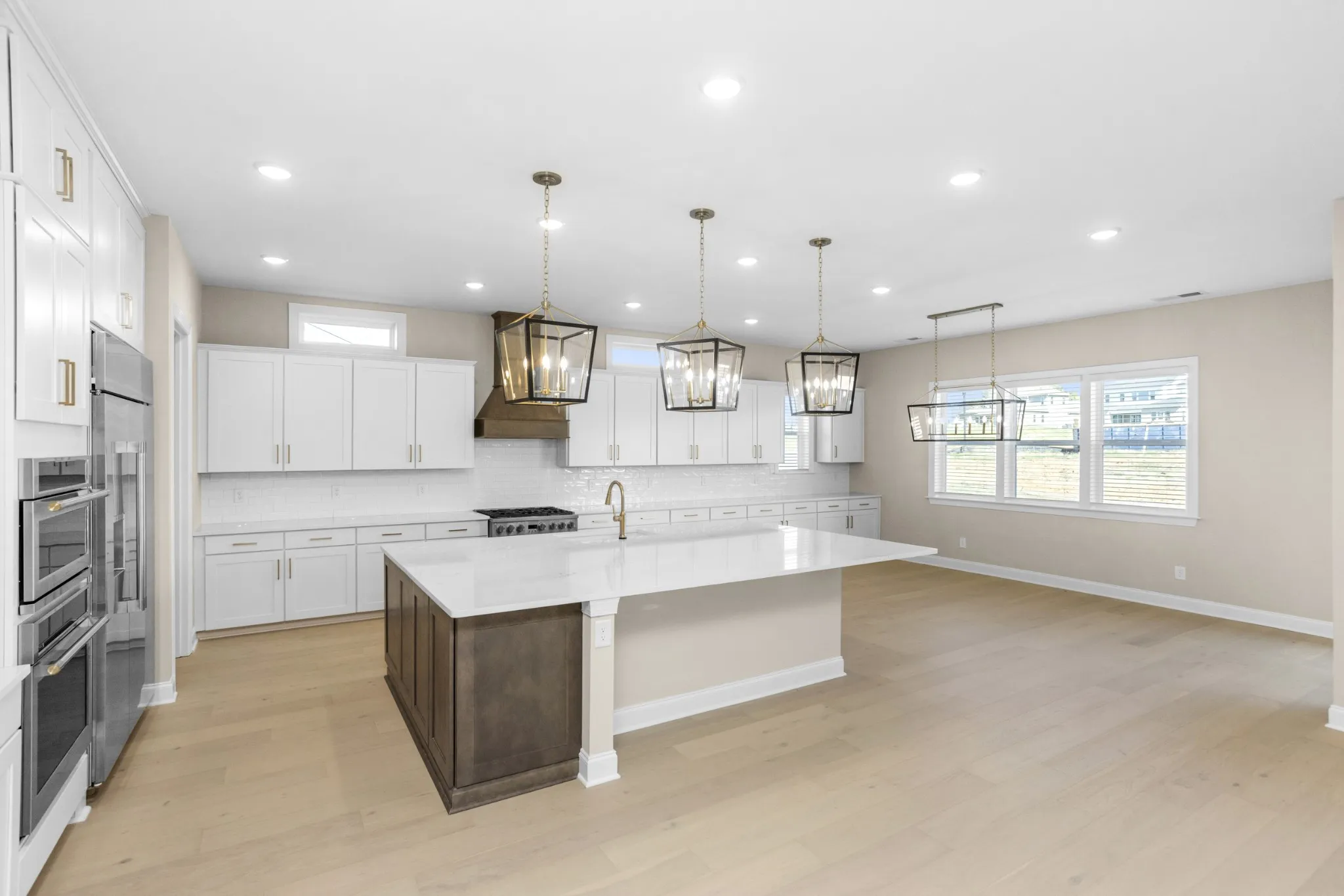 At the heart of the home, the gourmet kitchen—with oversized island, Monogram stainless appliances, and abundant storage—sets the stage for holiday entertaining. The living area extends to a covered porch through dramatic slide-away glass doors, creating seamless indoor-outdoor celebrations.