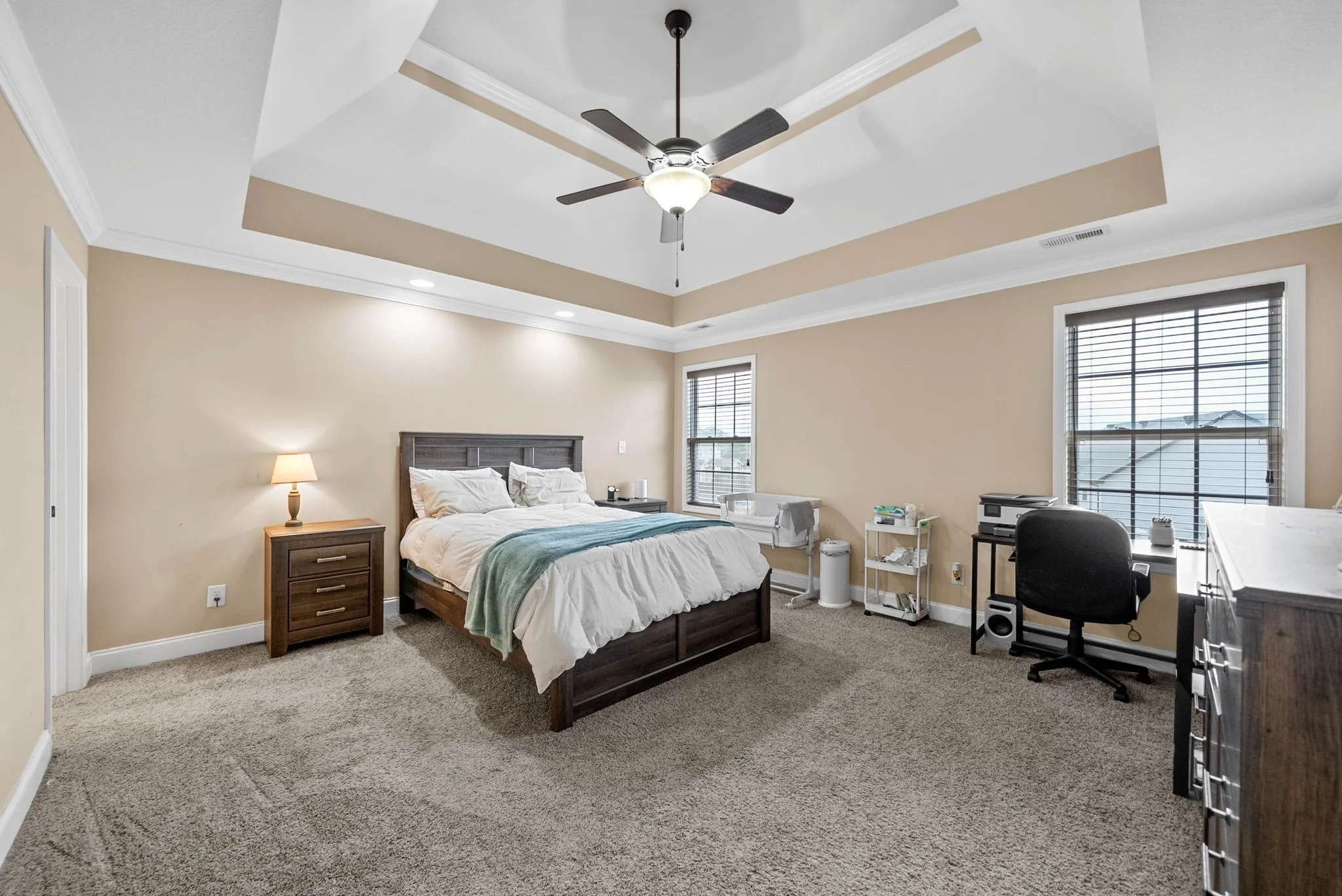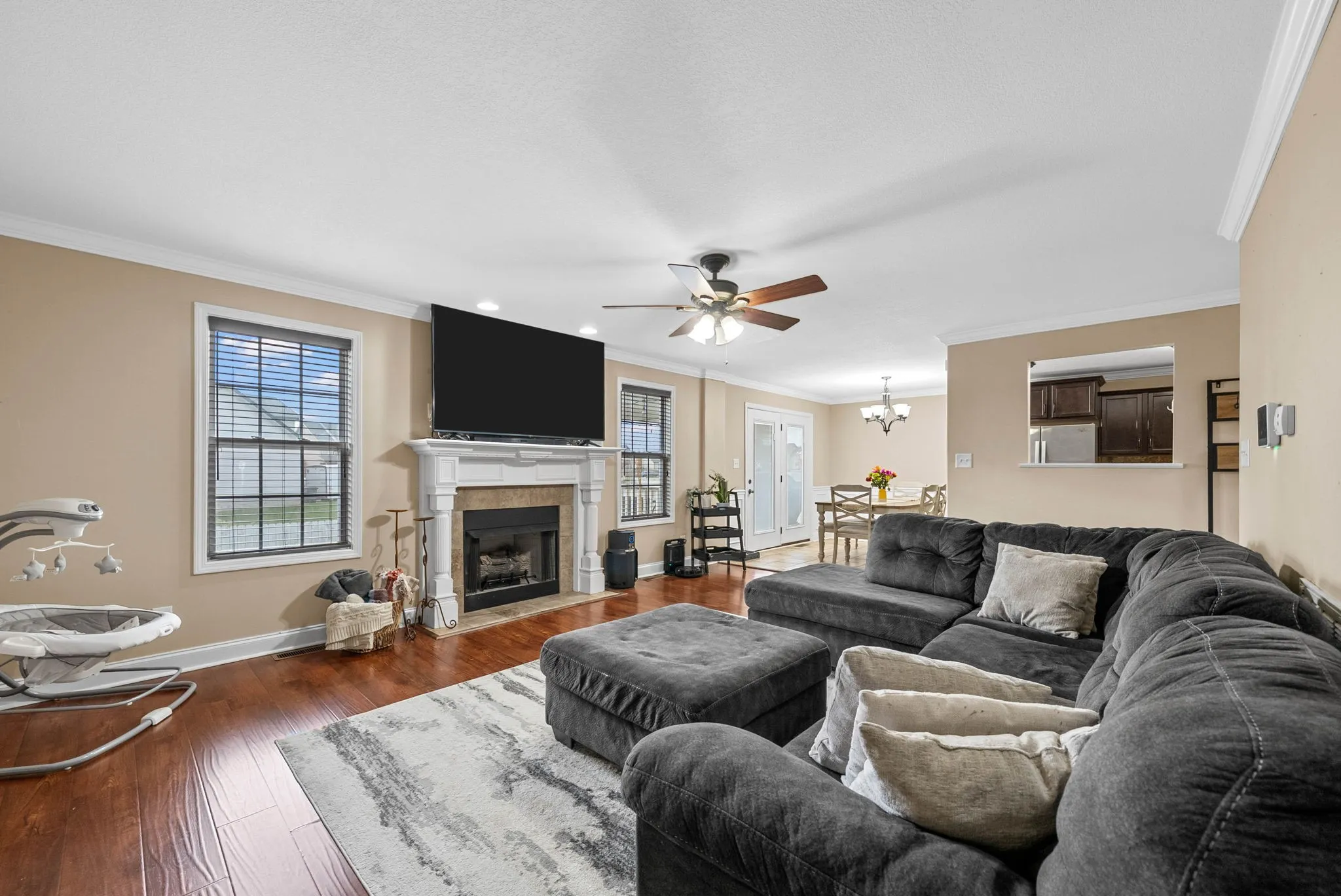 This stunning three-bedroom, two-and-a-half-bath home is conveniently located just a short drive from Fort Campbell Army Base with easy access to Interstate 24. The home features vaulted ceilings, a stylish tile backsplash in the kitchen, and a cozy gas fireplace that adds warmth and charm to the living area. The spacious primary suite boasts elegant double tray ceilings, a luxurious bathroom with dual vanities, a soaking tub, and a separate walk-in shower. Step outside to enjoy your covered back deck perfect for relaxing or entertaining overlooking a fully fenced backyard that provides privacy and comfort.