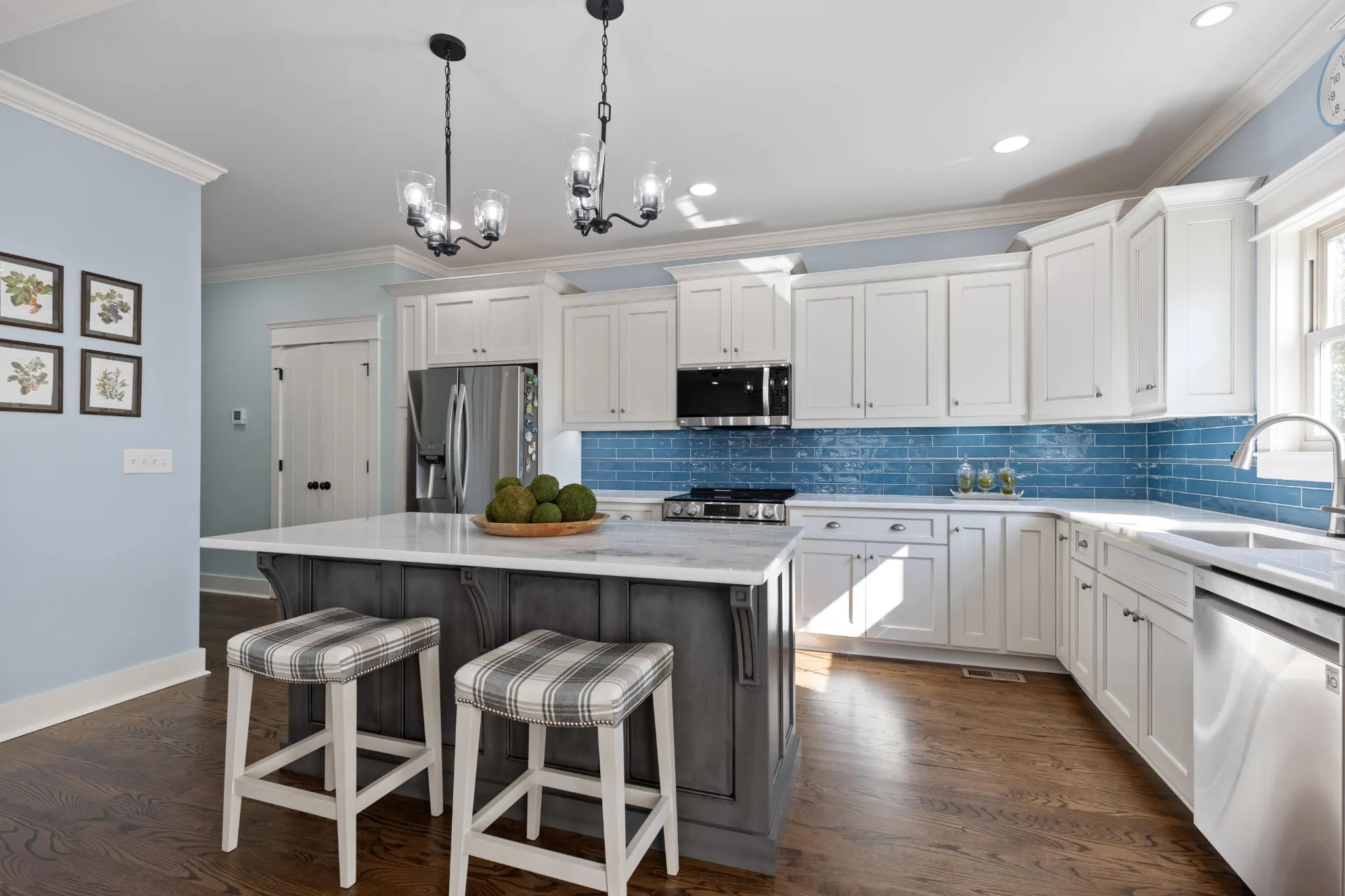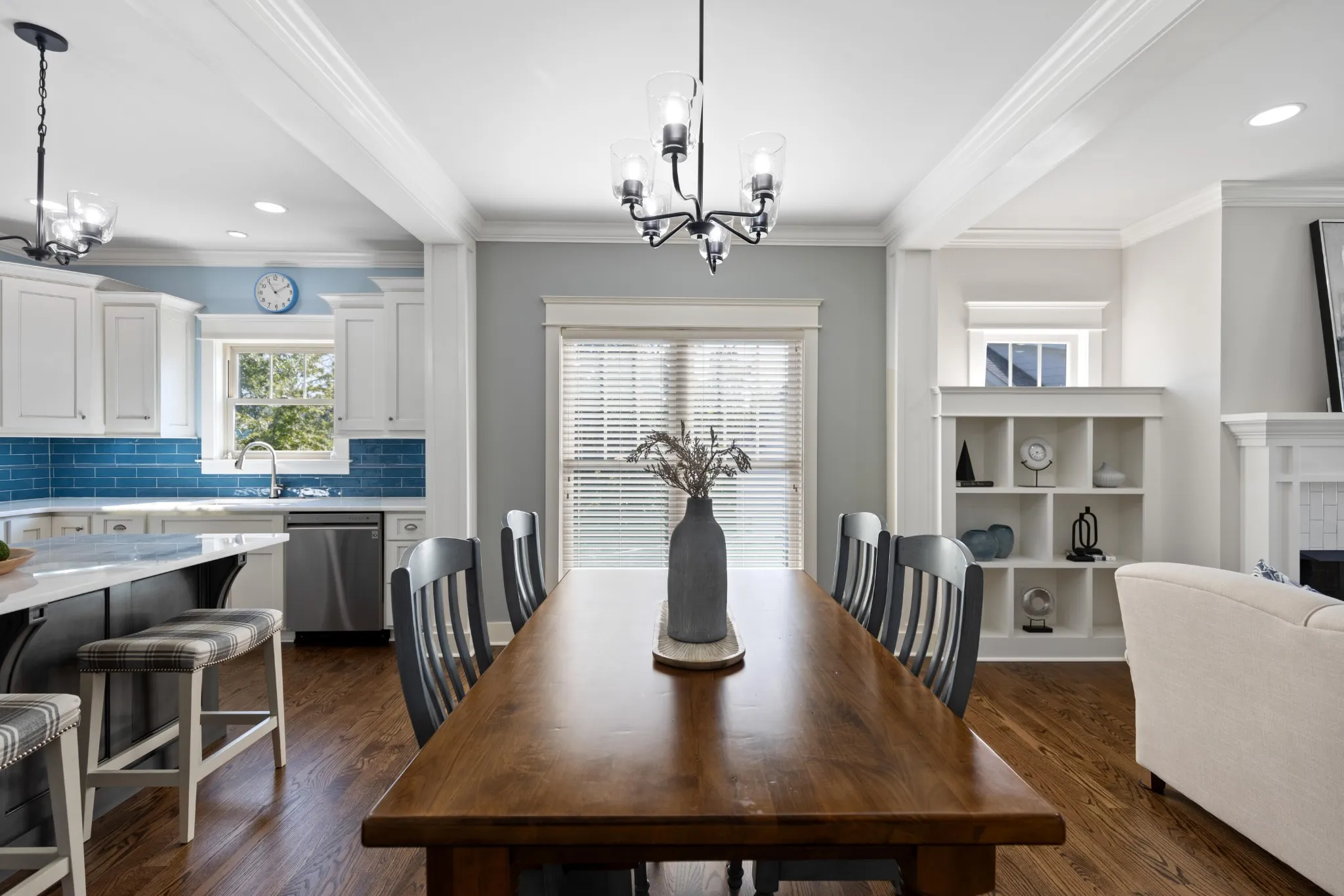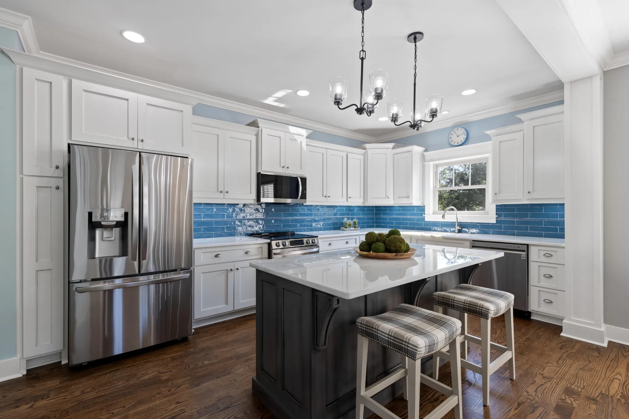 Inside, you'll find gleaming refinished hardwood floors, fresh interior paint, and an inviting open-concept layout. The cozy living area features a fireplace flanked by custom built-ins, flowing seamlessly into the beautifully updated kitchen with LG ThinQ smart appliances, farmhouse sink with Delta touch technology faucet, quartzite countertops, custom cabinets with soft close, evoking glazed tile backsplash, and under-cabinet lighting.\r\n