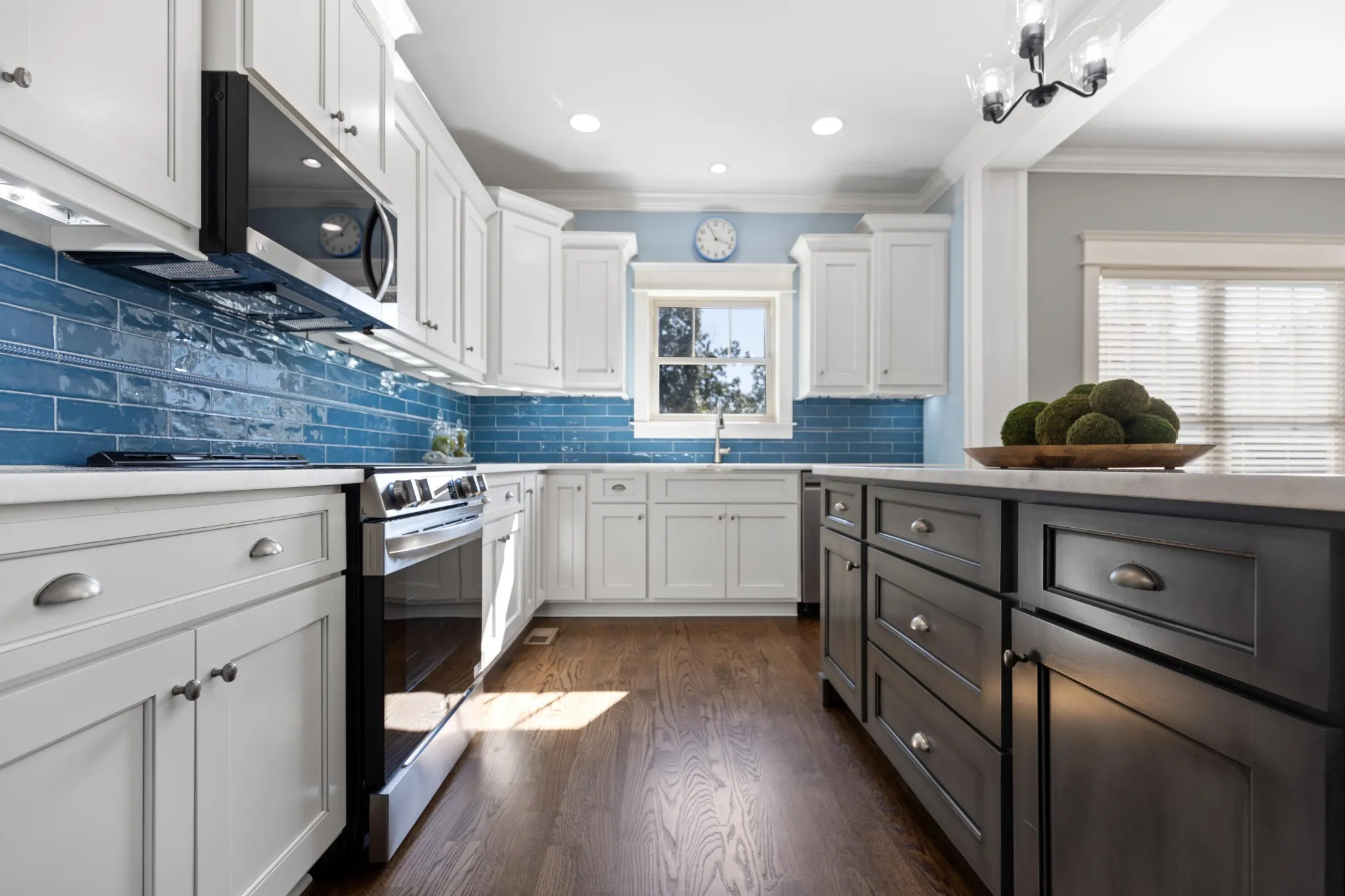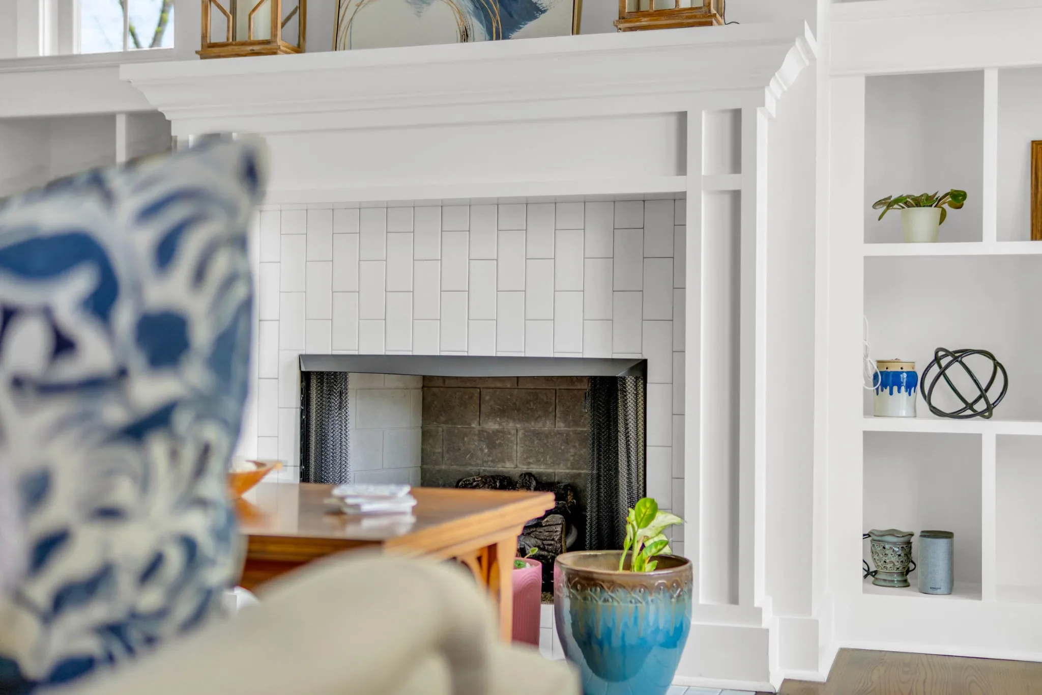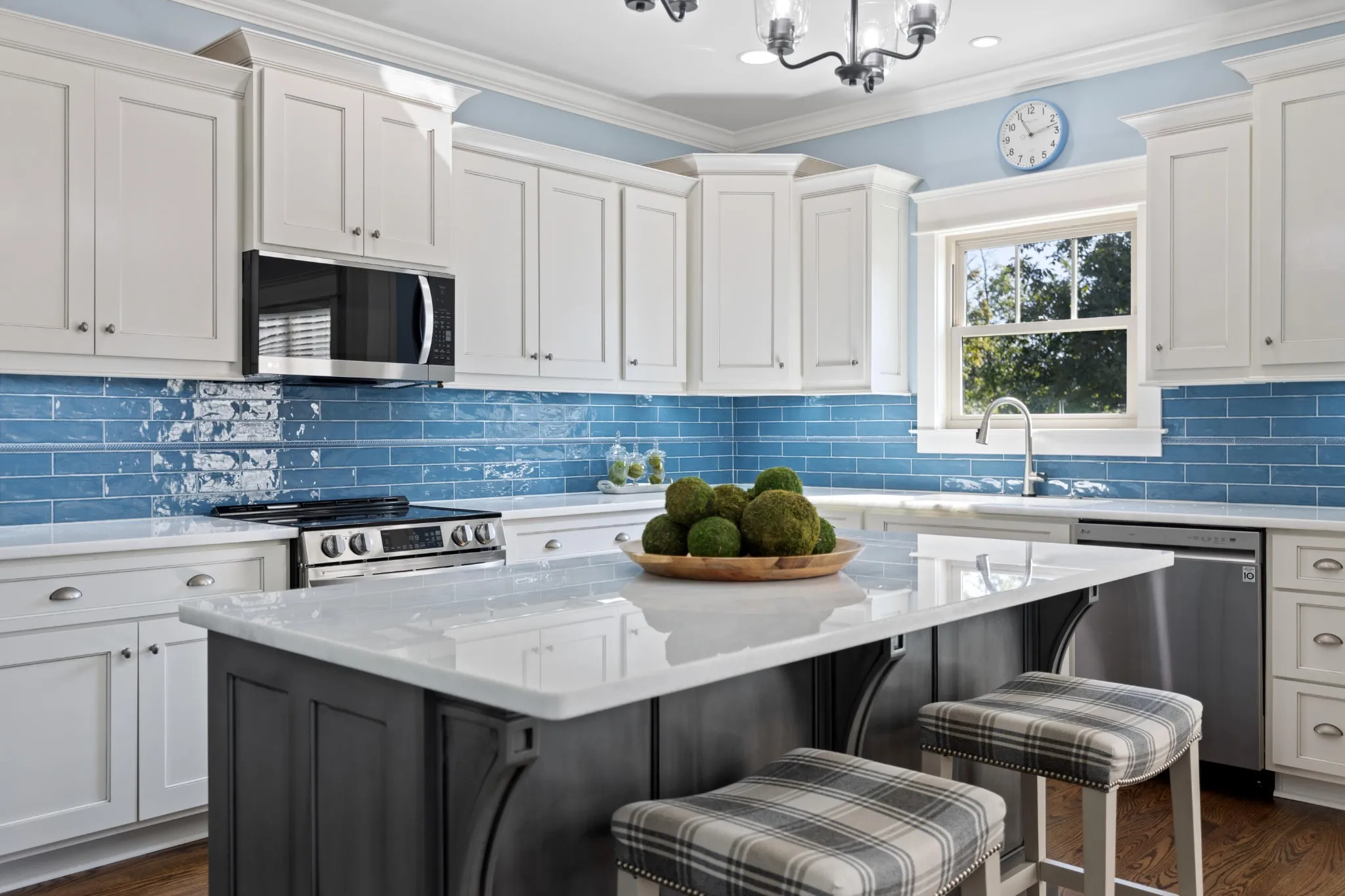 Inside, you'll find gleaming refinished hardwood floors, fresh interior paint, and an inviting open-concept layout. The cozy living area features a fireplace flanked by custom built-ins, flowing seamlessly into the beautifully updated kitchen with LG ThinQ smart appliances, farmhouse sink with Delta touch technology faucet, quartzite countertops, custom cabinets with soft close, evoking glazed tile backsplash, and under-cabinet lighting.\r\n