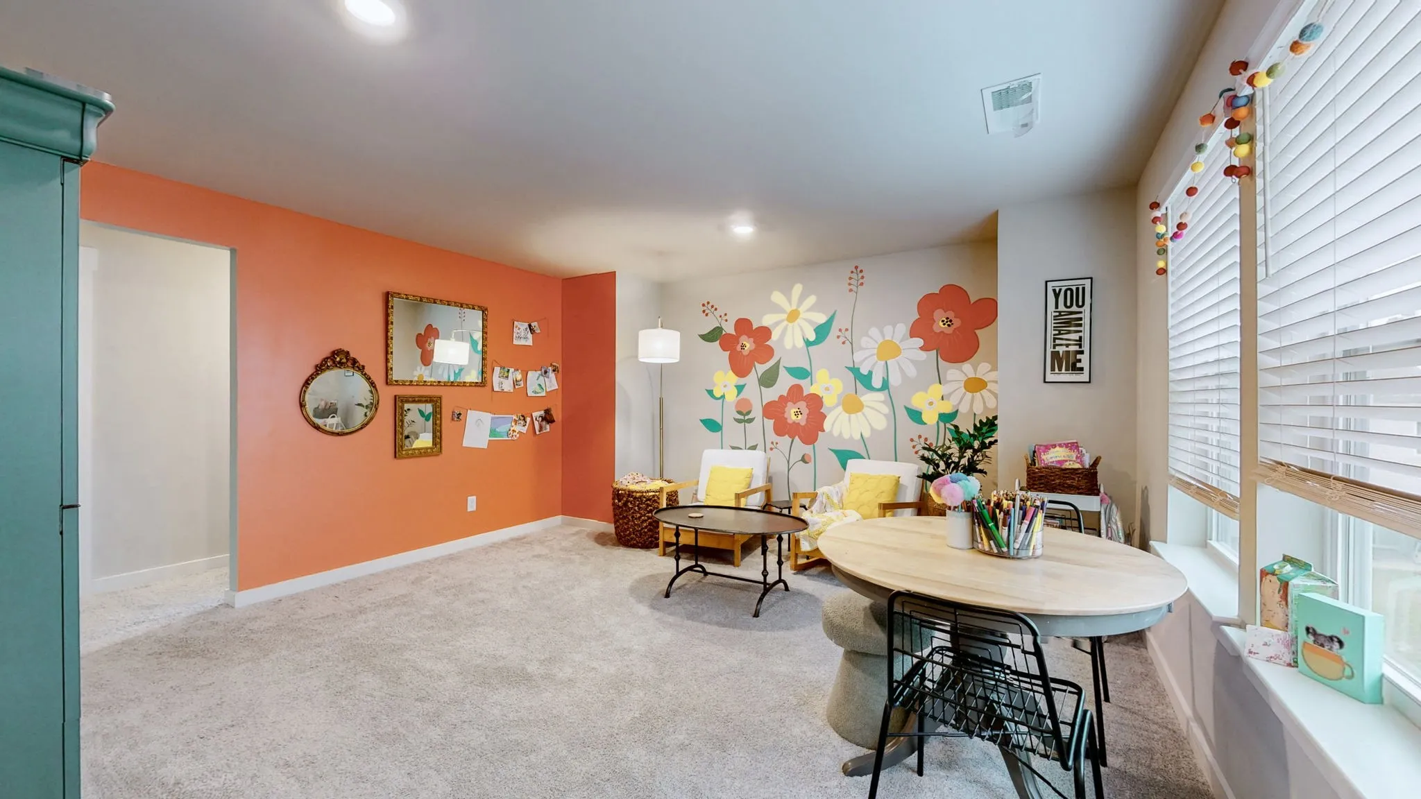 The main-level flex room with a full bath is ideal for guests or a home office. Outside, enjoy a partially fenced backyard and patio perfect for outdoor relaxation. Custom upgrades throughout the home — including designer accent walls, a custom laundry room, and a hand-painted feature wall in the bonus room — make this home truly one of a kind.