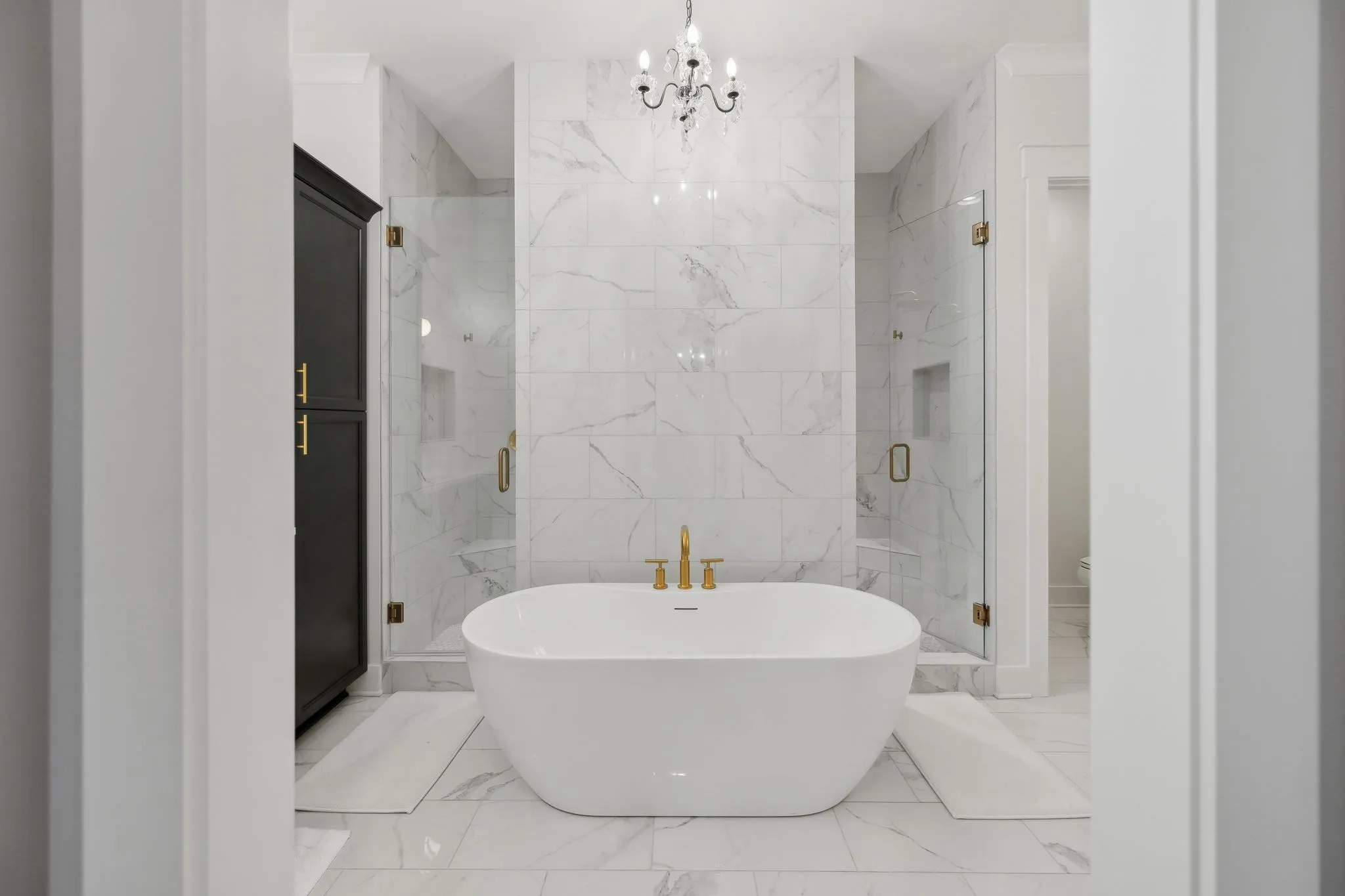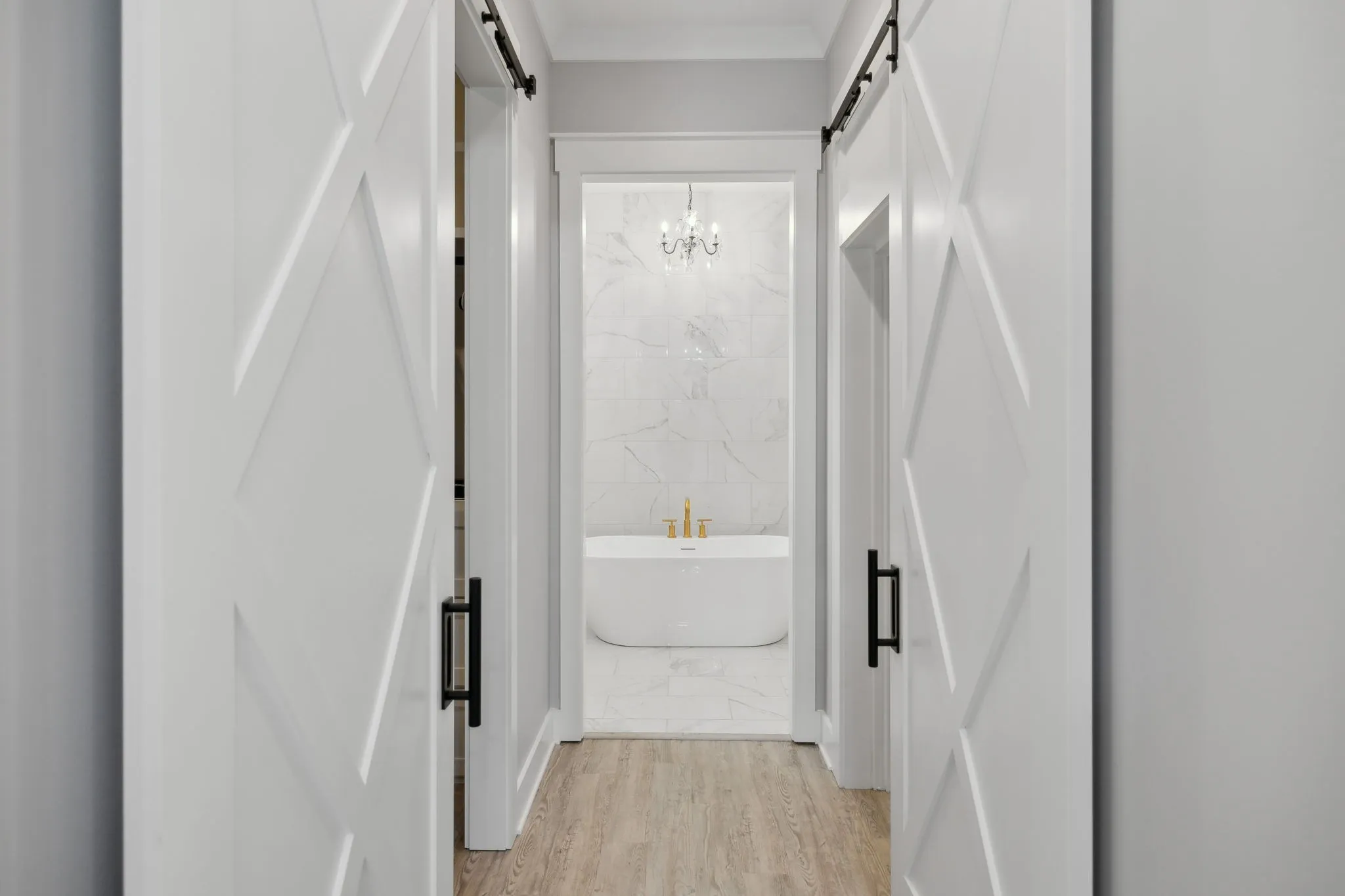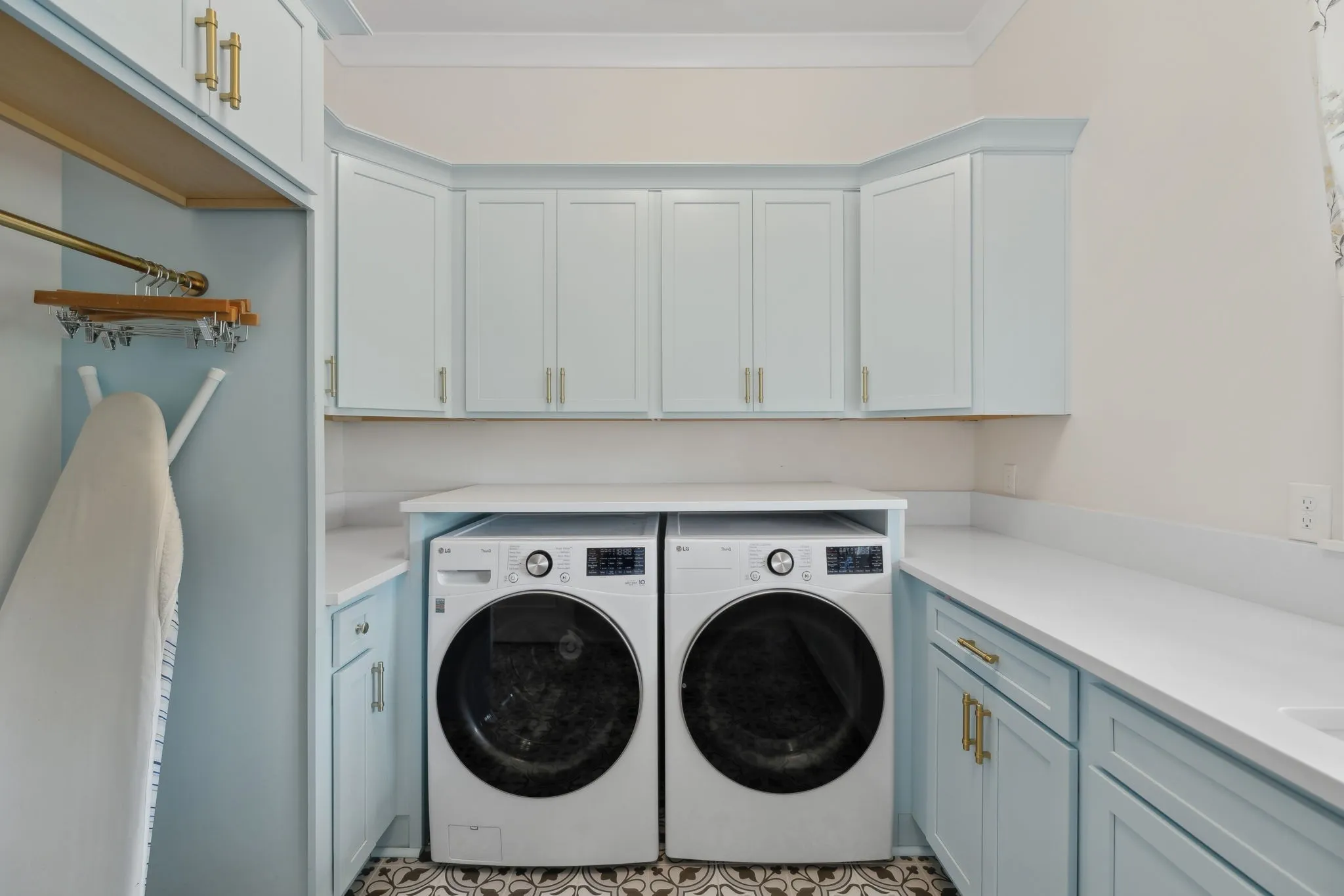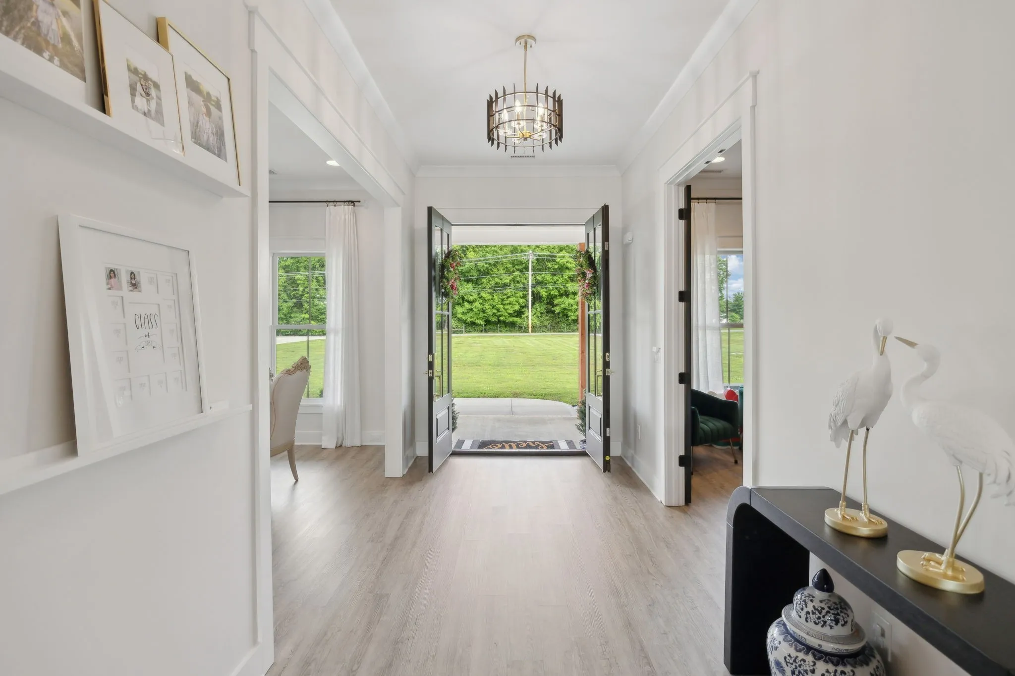 Step inside to an open concept living area that smoothly transitions into a chef’s kitchen. This space features an oversized island with waterfall countertops, a herringbone backsplash, and high-end stainless steel appliances, including a pot filler and farmhouse sink. Golden door pulls, soft-close drawers, and a beverage station enhance functionality, while a walk-in butler’s pantry with butcher block counters is ideal for meal prep.