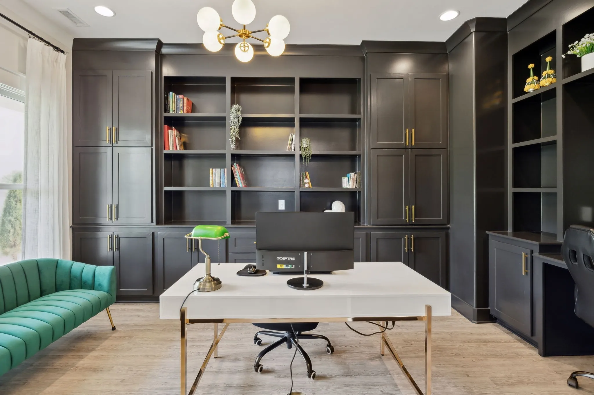 Throughout the home, decorative lighting, tall doors, and crown molding contribute to an elegant atmosphere. The formal dining room and office space are equipped with custom built-ins for added style and practicality. The owner’s suite offers a private retreat with double rain head showers, a soaking tub, and his-and-her oversized closets with barn doors. A thoughtfully concealed interior storm shelter provides peace of mind.