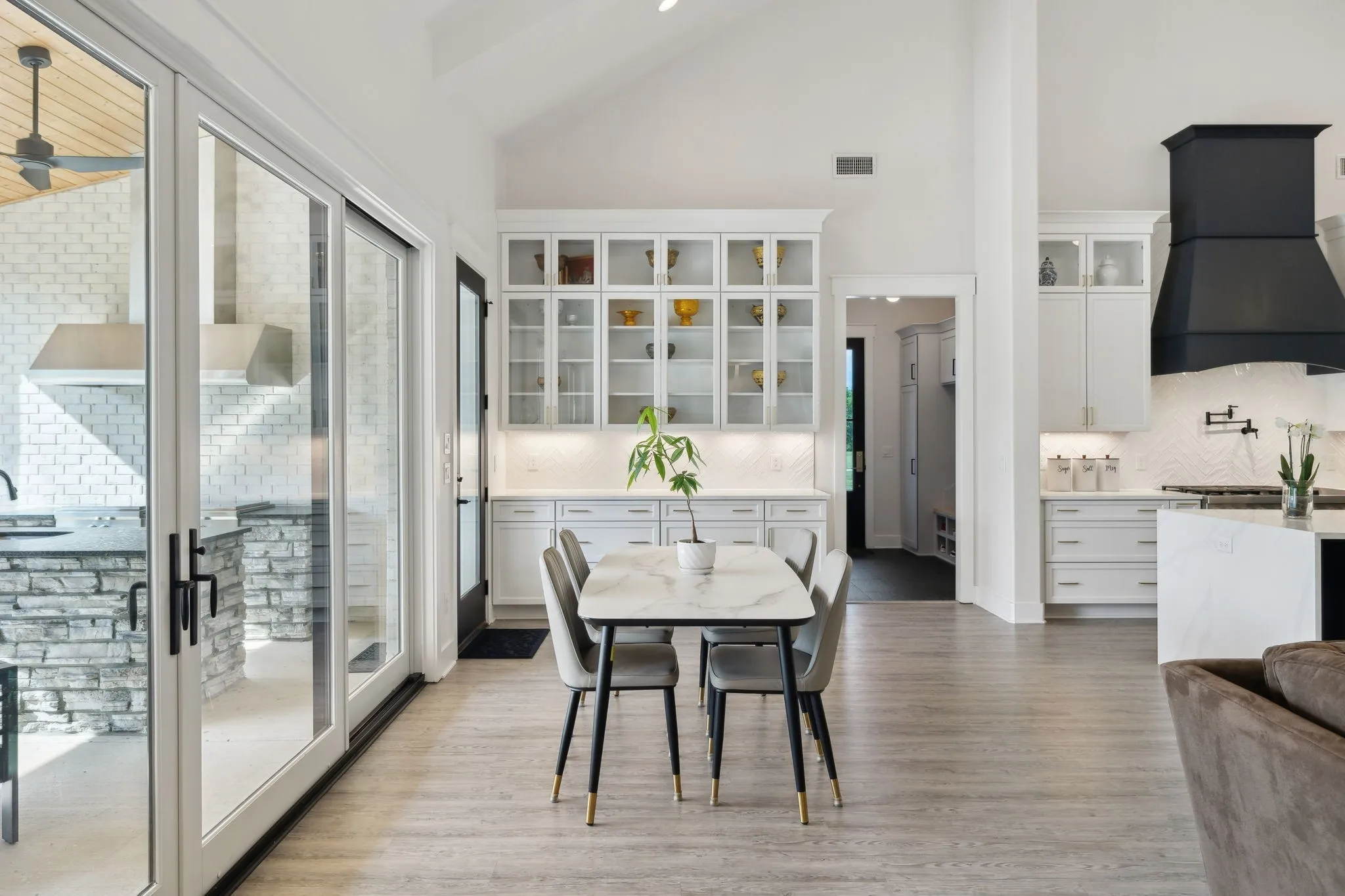 Outside, the expansive rear patio, adorned with stone and wood details, invites you to enjoy the peaceful surroundings, complete with wok stoves for outdoor cooking. The white brick exterior with black trim enhances the home’s modern appeal.