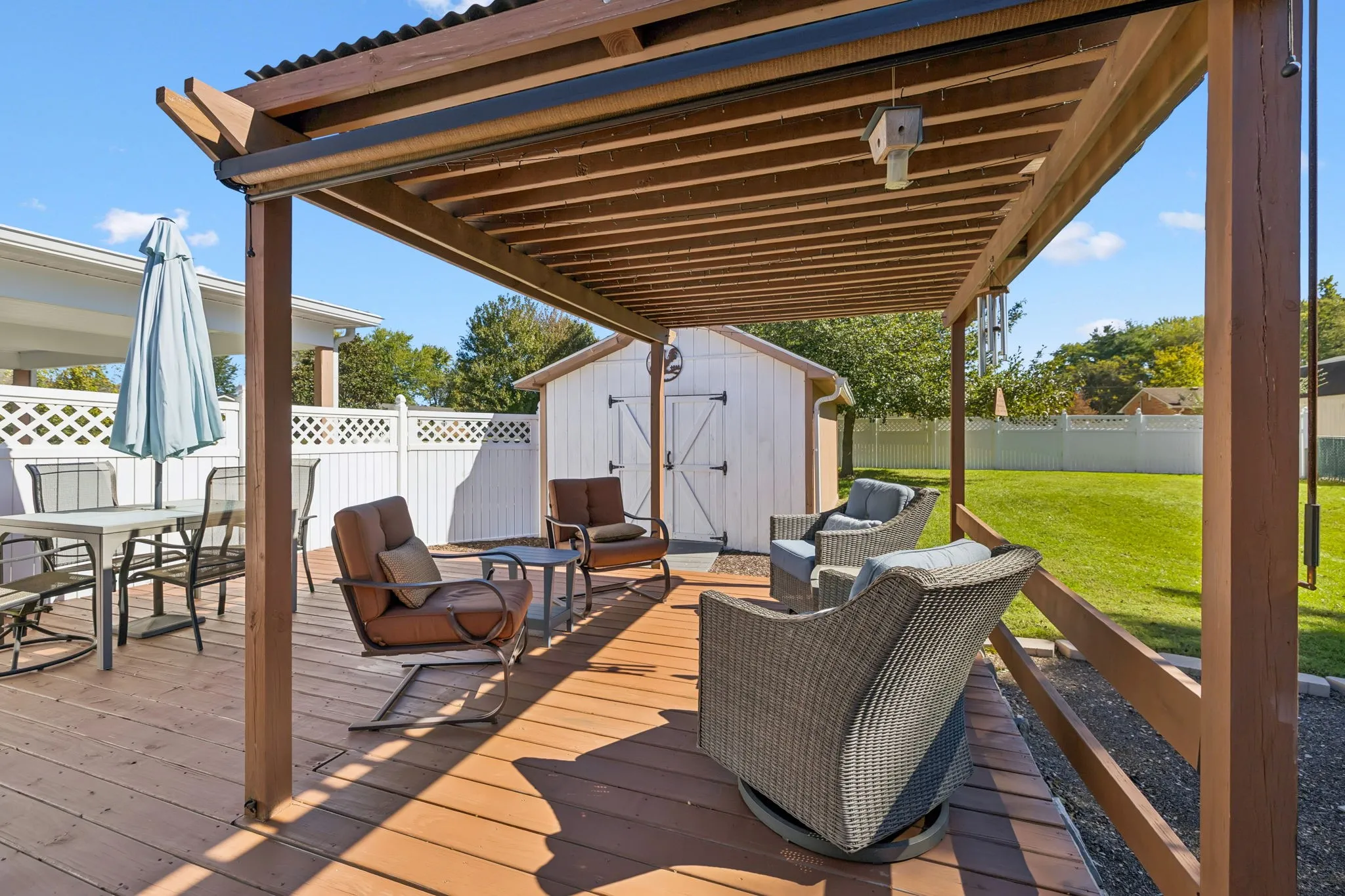 Need space for hobbies, gym stuff, crafting, or your secret wood-turning TikTok career? There’s a bonus outbuilding ready for all of it. Out back, unwind under the pergola on the deck and enjoy your low-maintenance vinyl privacy fence.