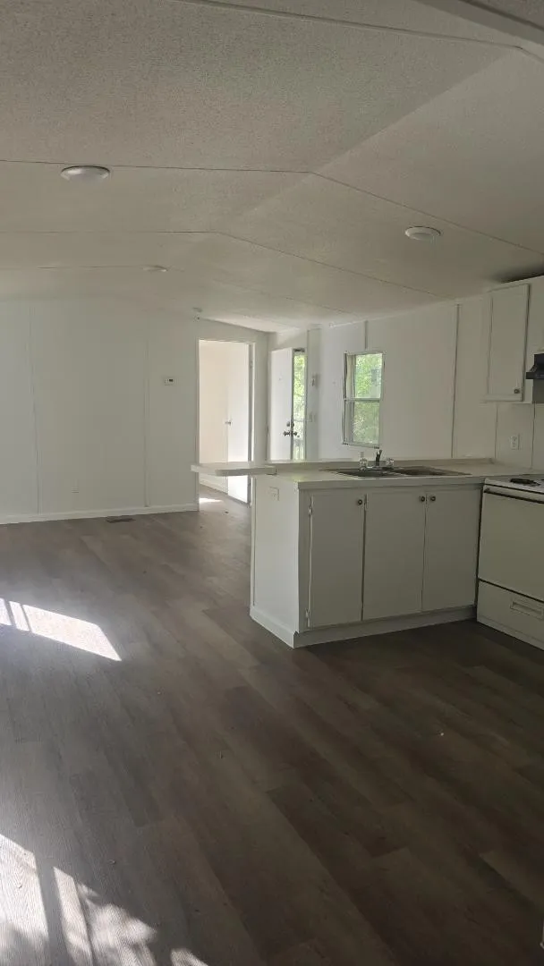 Step inside to find a bright open floor plan with updated flooring, fresh paint, and modern light fixtures throughout. The spacious living area flows directly into a clean, functional kitchen featuring white cabinetry, ample counter space, and included appliances. Large windows bring in plenty of natural light, giving the space a warm and airy feel.