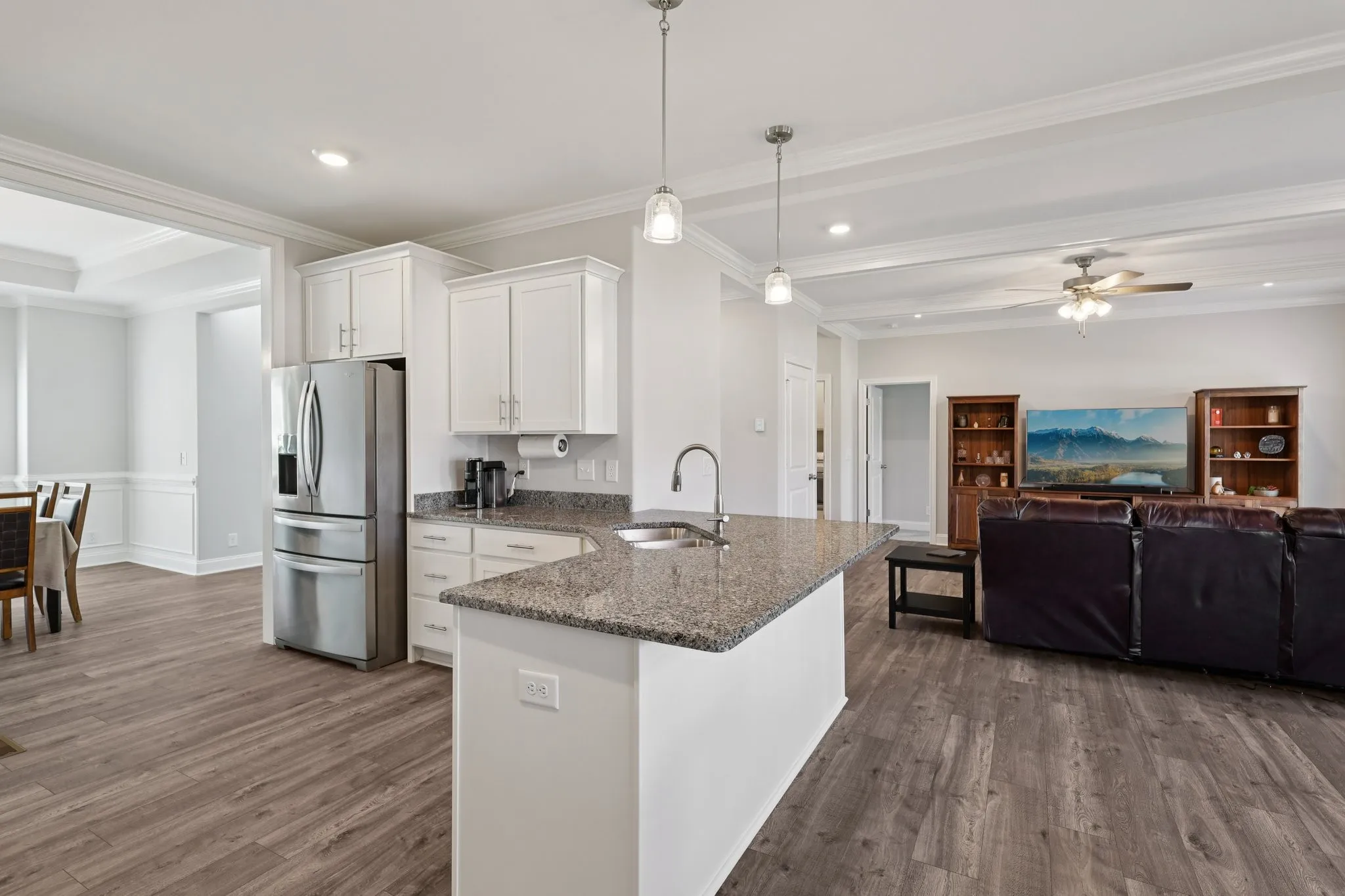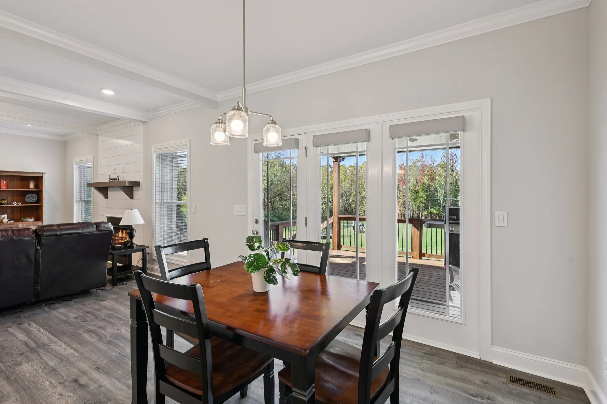 Discover this meticulously maintained 4 bedroom, 3.5 bathroom brick home in River Chase, offering ultimate privacy as the backyard backs up to a wooded area and the Cumberland River. The main floor features a bright, open floorplan with custom millwork and crown moldings, plus a formal dining room that could easily be used as an office or bonus room. The great room, complete with a cozy fireplace, flows into the kitchen boasting granite counters, white soft-close cabinetry, SS appliances, counter seating and walk-in pantry. Enjoy wide open views from your covered rear deck. The main-level Primary Bedroom offers an ensuite with a double granite vanity, soaking tub, and tiled shower. Upstairs are three large bedrooms with walk-in closets, two full baths with quartz countertops, a huge bonus room, and tons of walk-in attic storage. This prime Clarksville location provides easy access to Fort Campbell and major highways for a quick commute. Schedule a showing to see this one in person today!