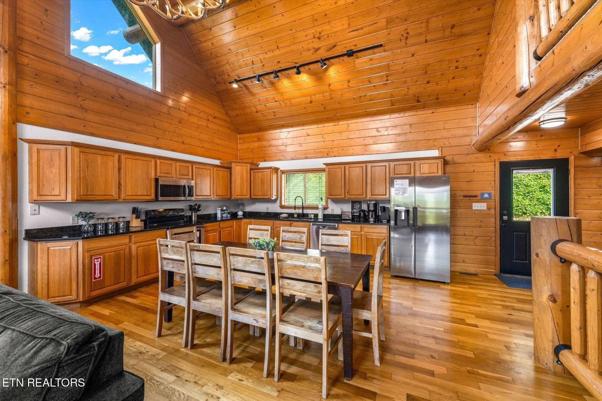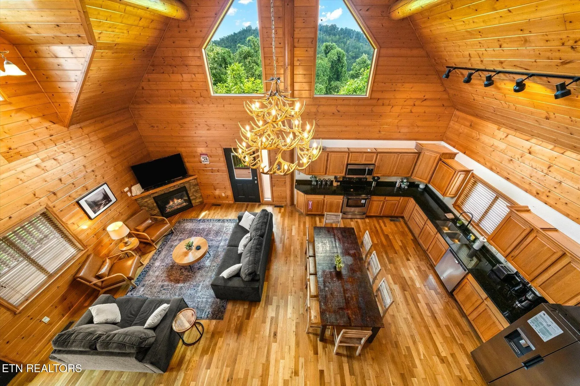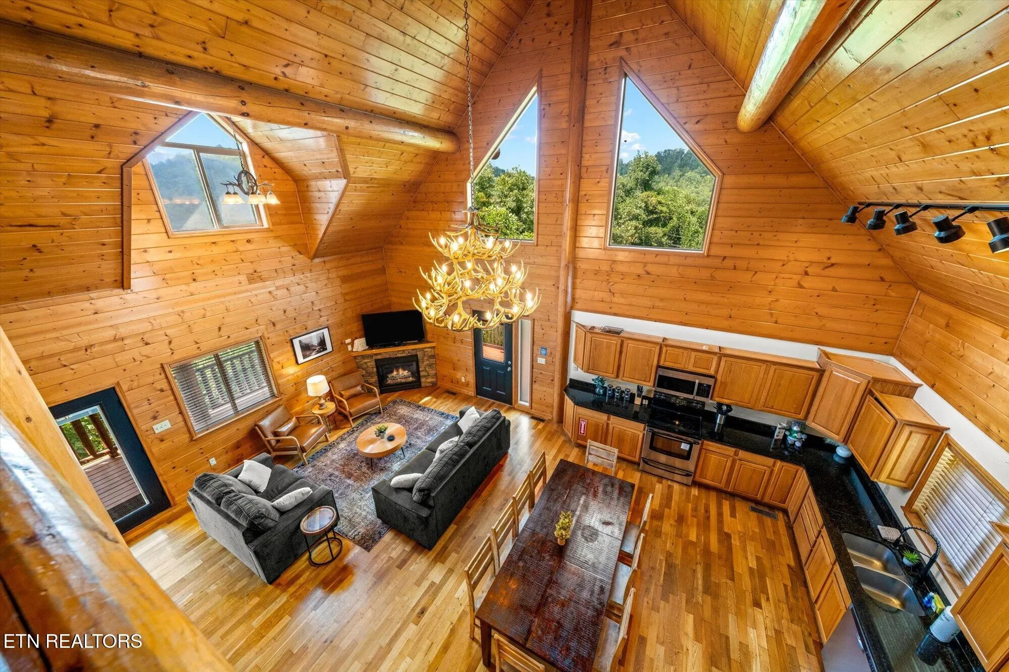 Step inside and you’ll love the warm cabin vibes, complete with wood-paneled walls, exposed beams, and vaulted ceilings that fill the home with charm and character. The kitchen features stainless steel appliances, and the main-level suite offers a private retreat with a dual vanity ensuite bath. Upstairs, the loft provides a fun space with a game table, extra sleeping area, and even its own private balcony.