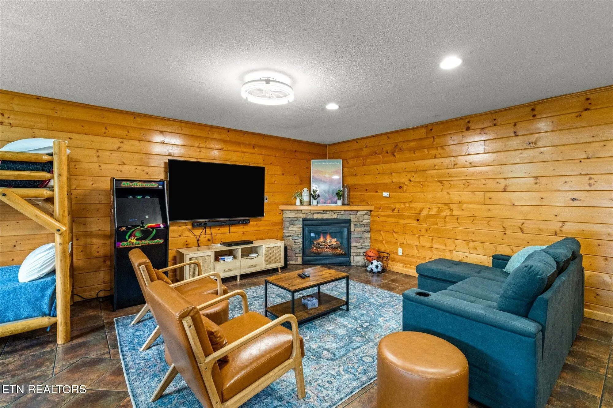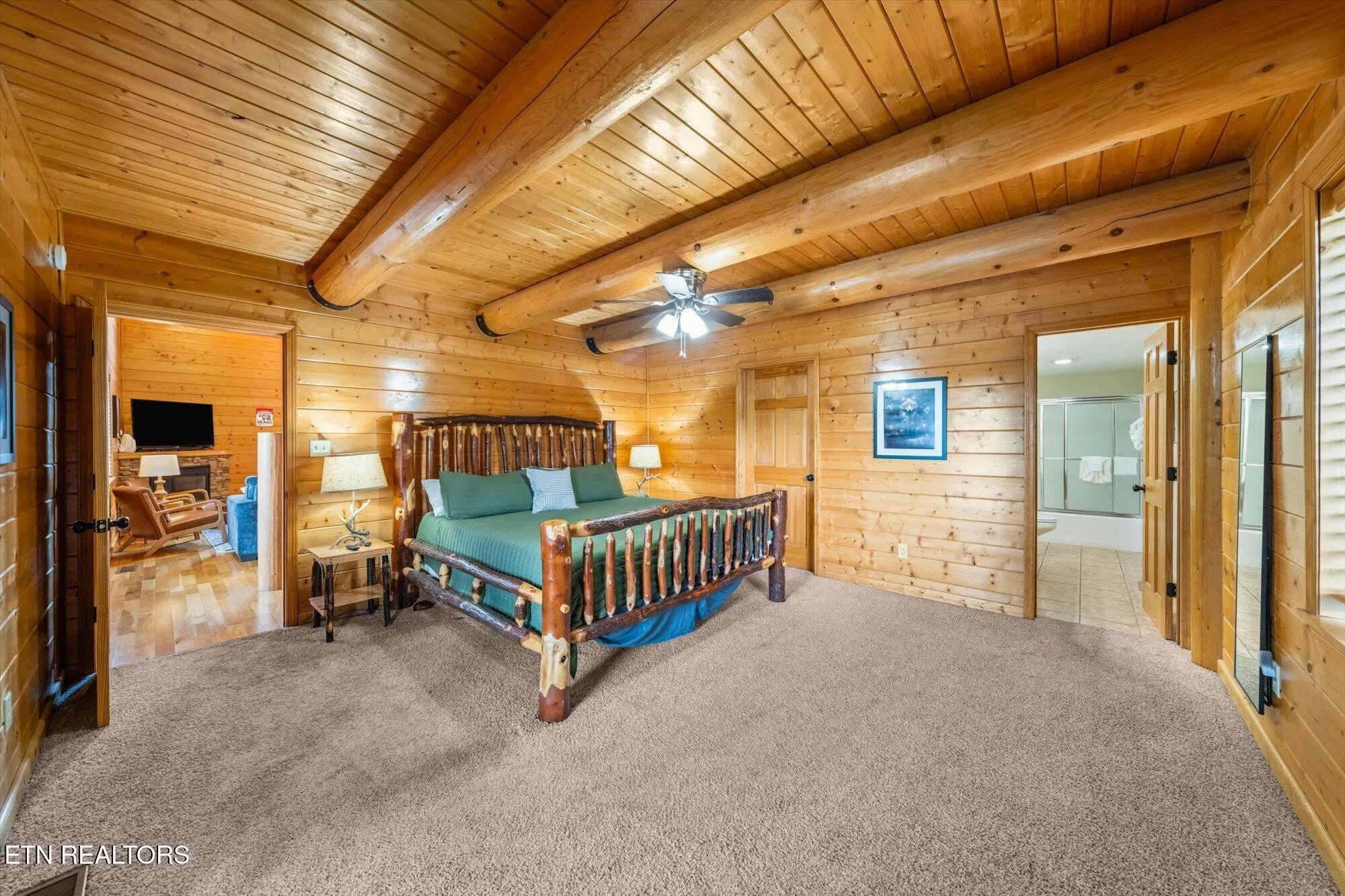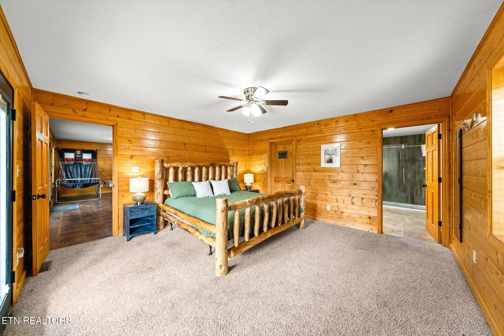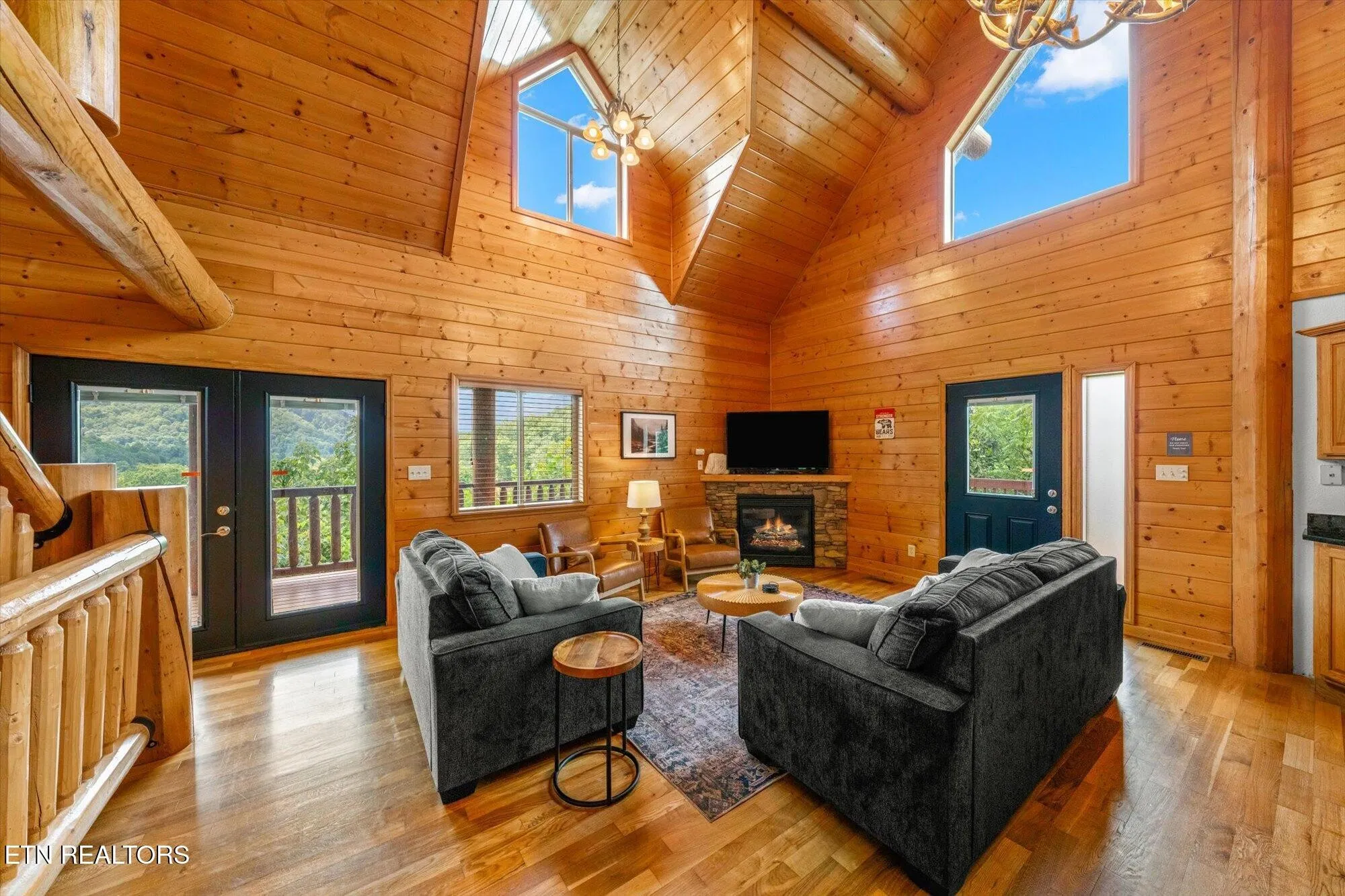Step inside and you’ll love the warm cabin vibes, complete with wood-paneled walls, exposed beams, and vaulted ceilings that fill the home with charm and character. The kitchen features stainless steel appliances, and the main-level suite offers a private retreat with a dual vanity ensuite bath. Upstairs, the loft provides a fun space with a game table, extra sleeping area, and even its own private balcony.