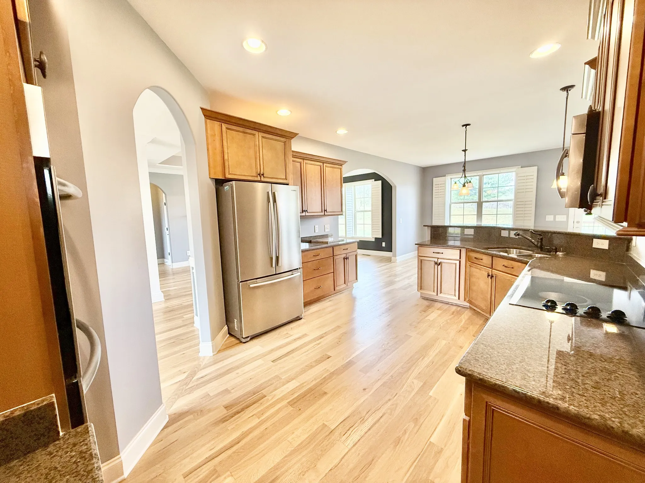 Granite countertops, stainless steel appliances with a double oven (gas conversion possible). The main living room includes a natural gas fireplace, complemented by a separate family room.