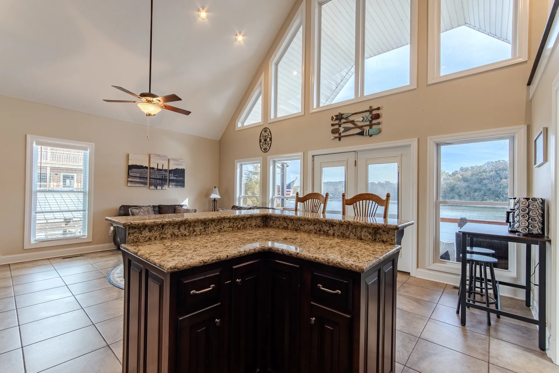 Main Level features Hardwood & tile floors, granite countertops, expansive covered deck