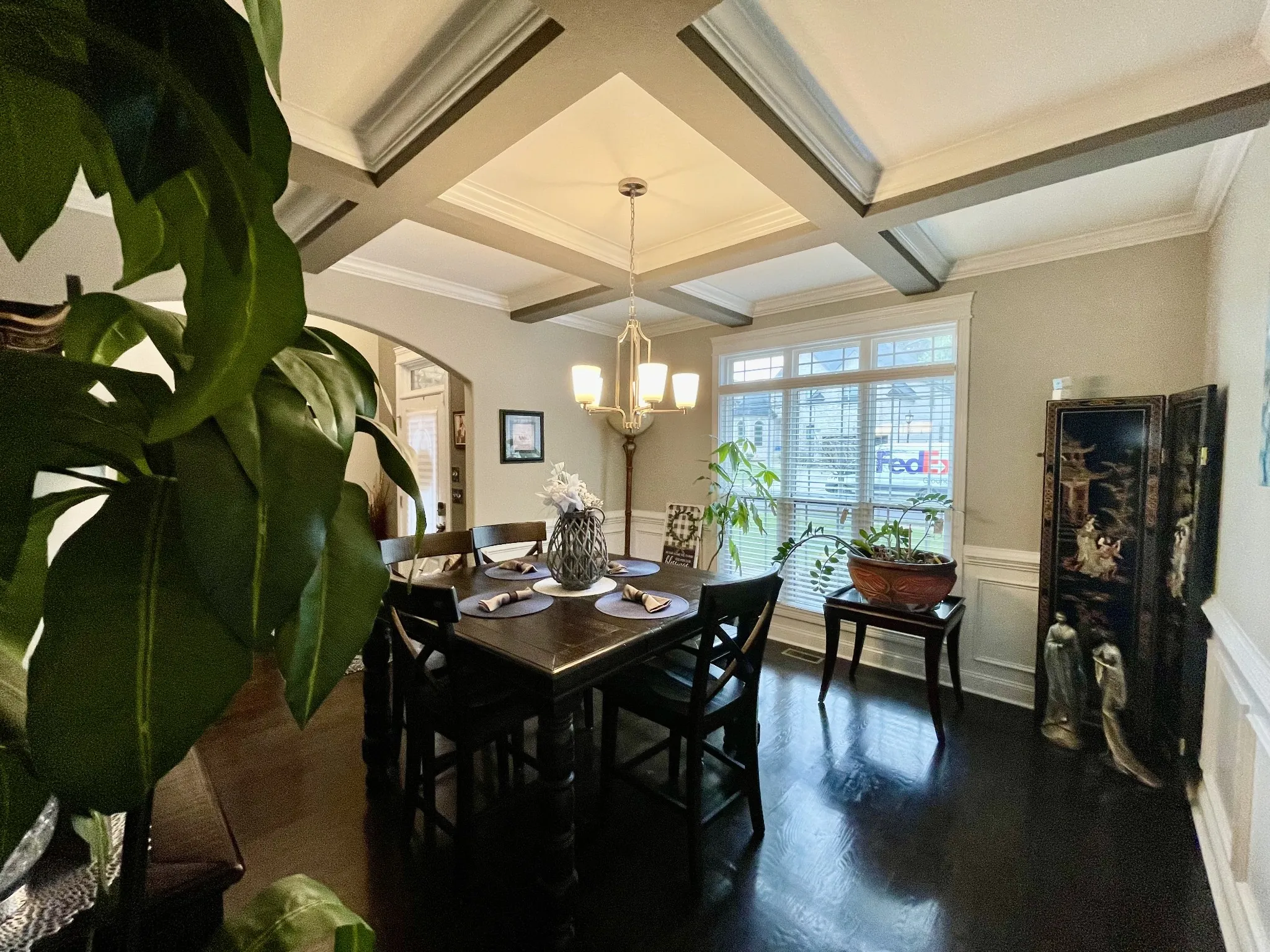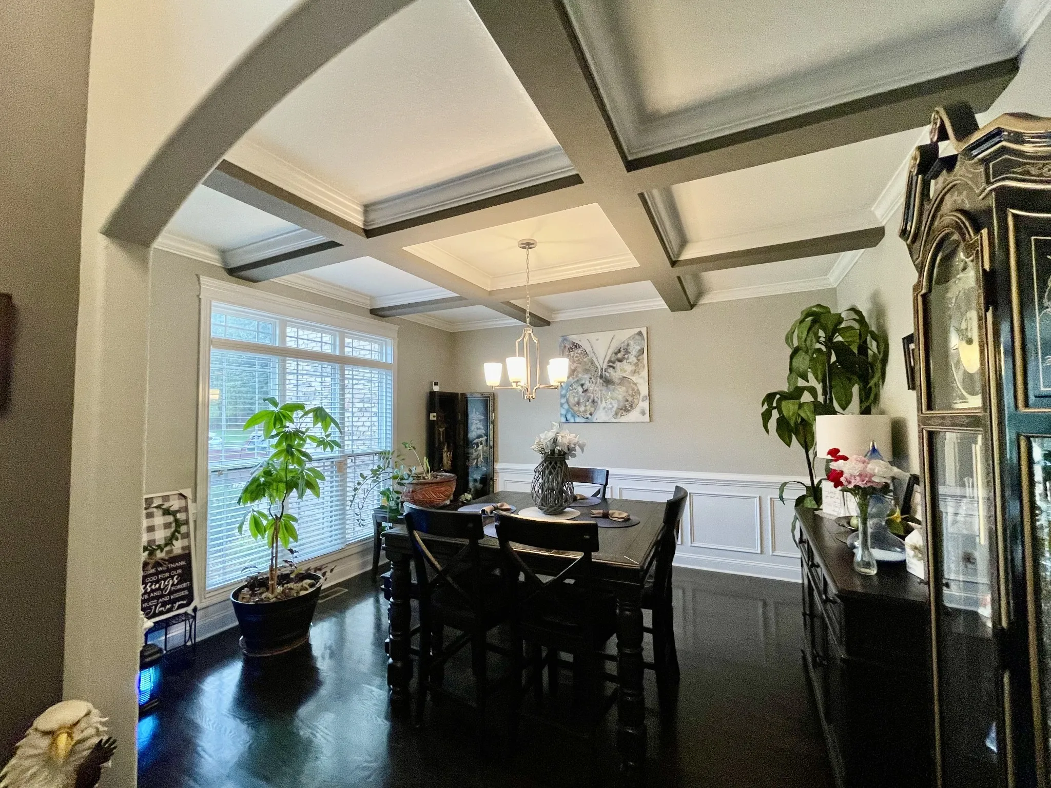 Living room hardwood floors on mail level. Stairs and 2nd floor landing. Great room has vaulted ceilings, gases fireplace and open floor plan and or open concept. Flows well into the master. Formal dining room w/ natural light, decorative trey ceiling and wainscoting.