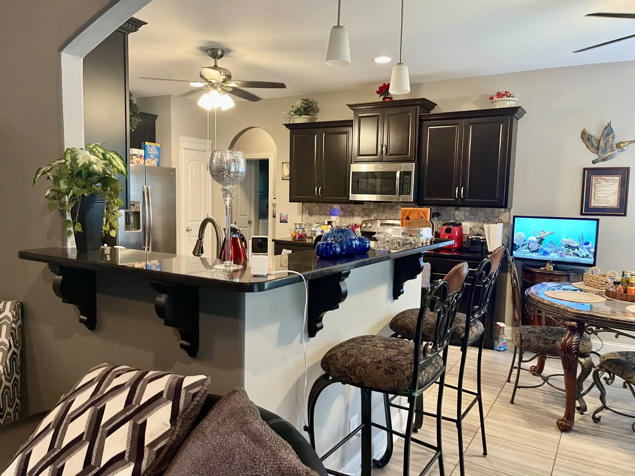 Kitchen made for a Chef w/granite counter tops, raised extended bar kitchen, abundant cabinets and ample storage. And an eating area that extends off to the living room to the cover deck.