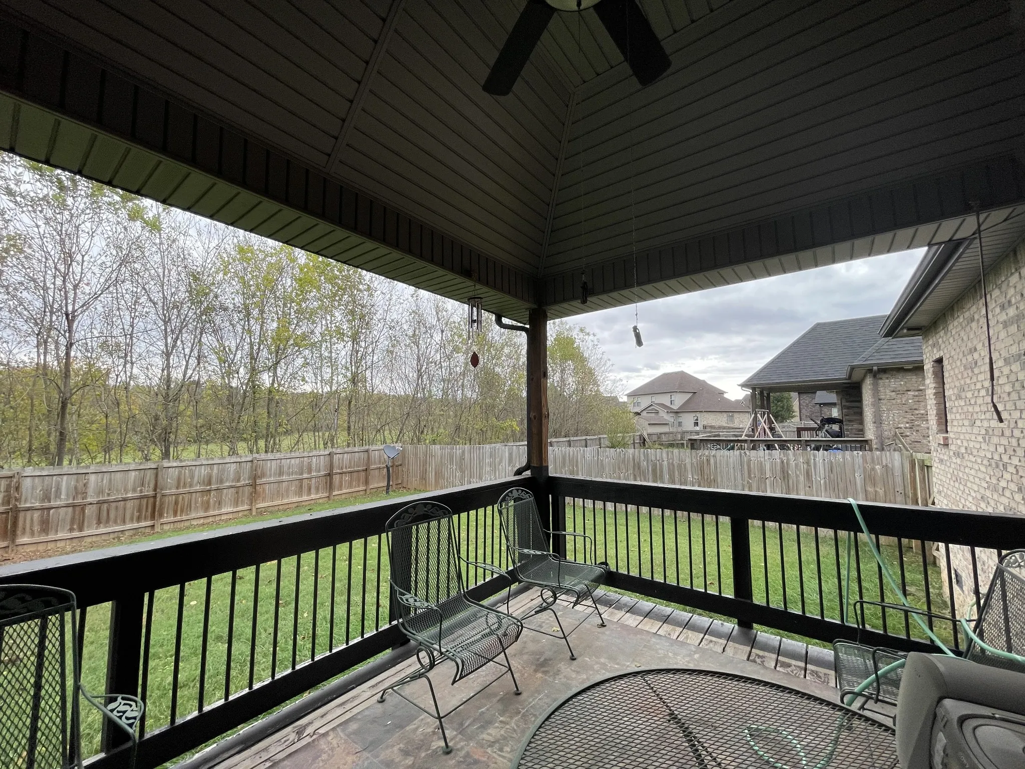 Covered deck w/no backyard neighbors and a leveled backyard.