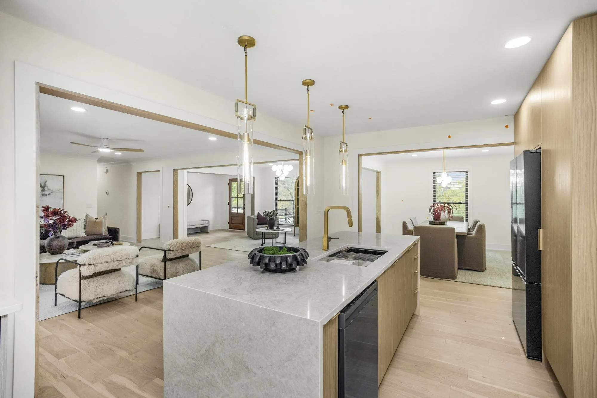The designer kitchen is a true showpiece—complete with Taj Mahal quartzite countertops, custom cabinetry, and brand-new black stainless steel appliances. Every detail has been thoughtfully selected to blend sophistication with everyday functionality.