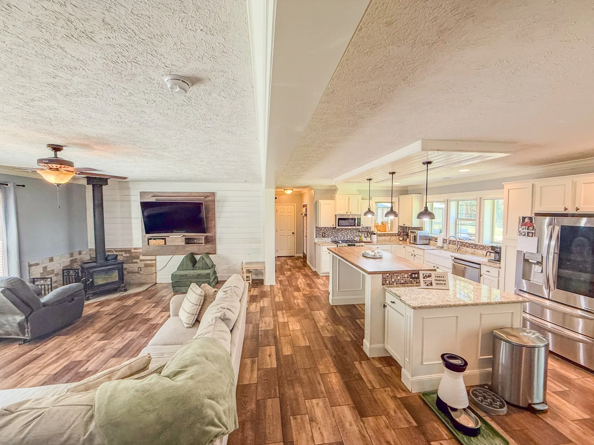 Cozy Living Room: Enjoy cozy evenings by the wood-burning stove in the expansive living room, perfect for family gatherings.