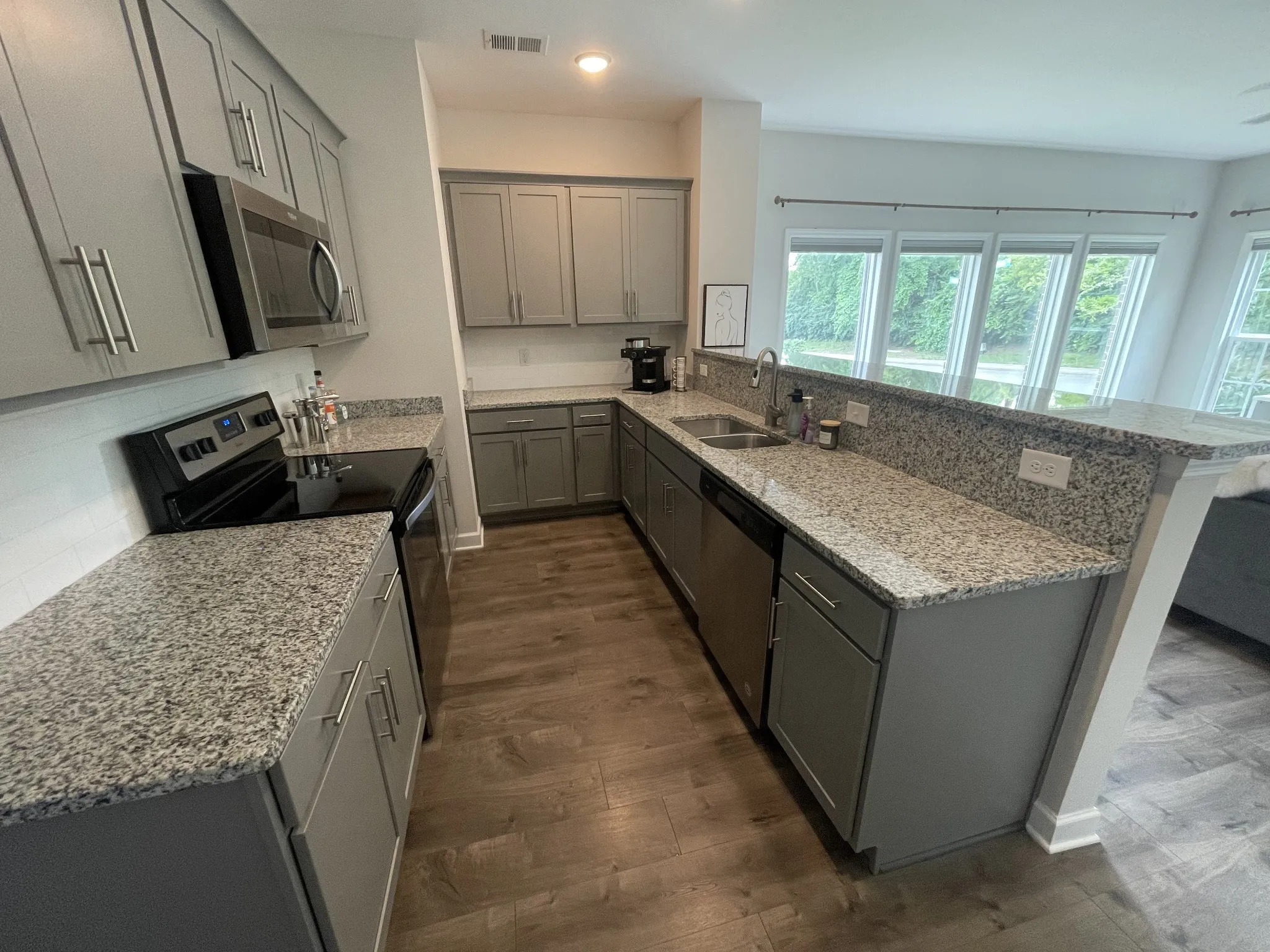 Corner lot with premium options! Former model home unit. Large upgraded windows throughout each room providing amazing natural light, kitchen granite countertops w/ tile backsplash, wide plank LVP floors on both levels – no carpet, large kitchen peninsula, two bedrooms w/ full bathrooms, half bath on main level, office/rec room, master has large walk in closet w/ window, finished garage, private driveway, and plenty of additional parking in front & rear of unit. Plenty of privacy with treeline across the street. Just a walk away from the lake and trail, community pool, dog park, clubhouse, and green spaces.