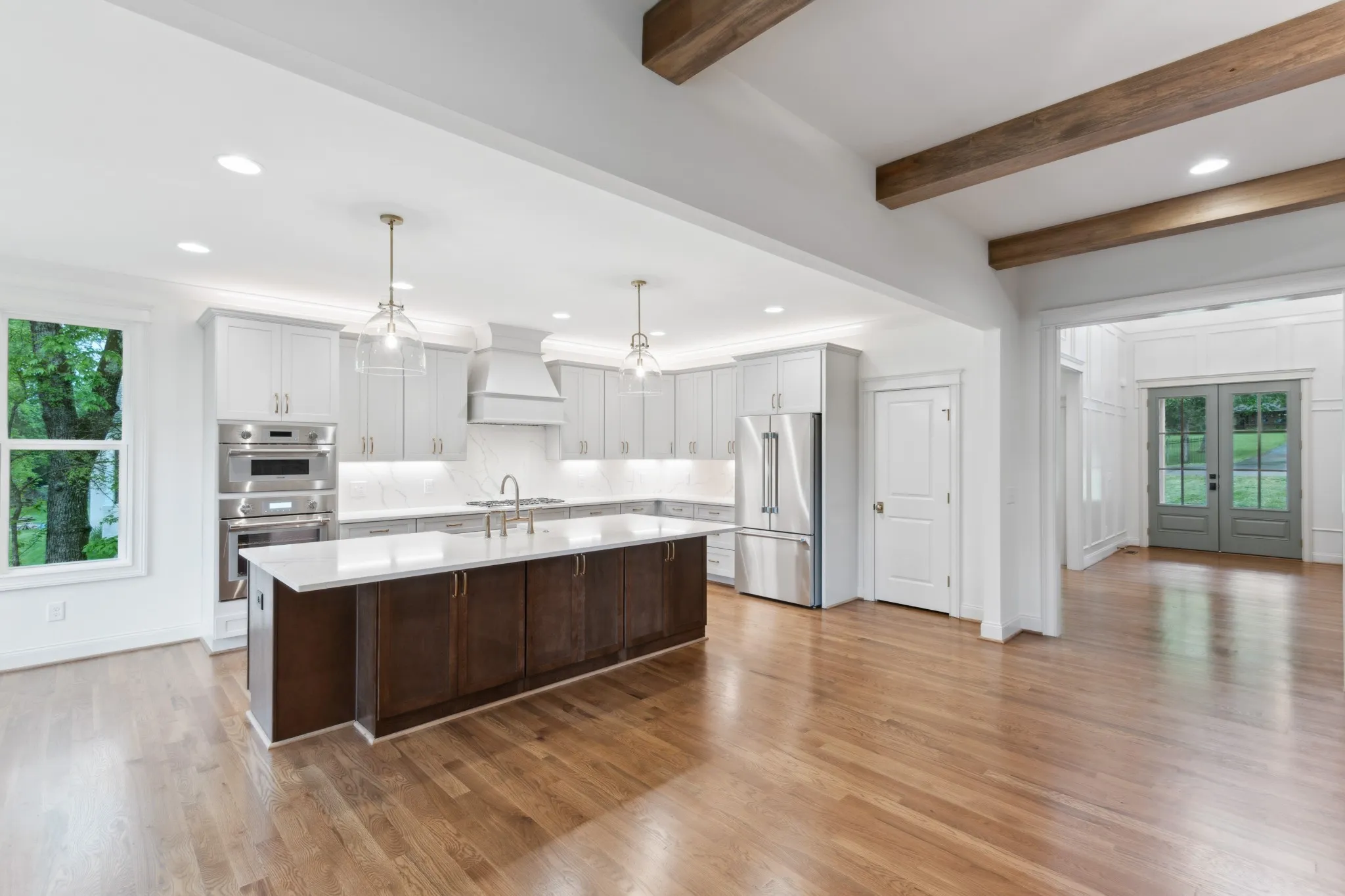 Premium finishes are INCLUDED: hardwood floors throughout the main level, quartz countertops in kitchen and baths, tile showers and floors, outdoor fireplace, stone fireplace in the family room, and detailed trim work throughout.\n