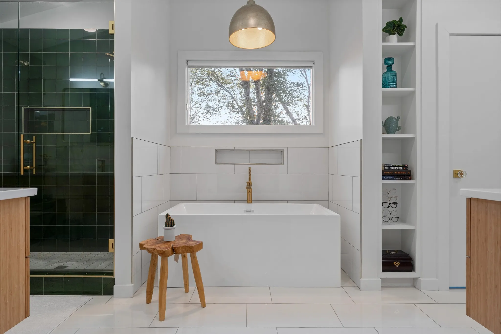 Some of the original 1960s floors remain in intentional spaces, restored to reveal the beautiful skinny plank detail that defines true mid-century design. The living room centers around a smooth plaster fireplace and custom cabinetry, adding layers of texture and calm. The kitchen is a showpiece, anchored by a massive picture window that overlooks the private backyard and frames a view of the heritage magnolia trees. Custom wood tones, new tile, and a clean, functional layout make it a space to gather, cook, and unwind.\n