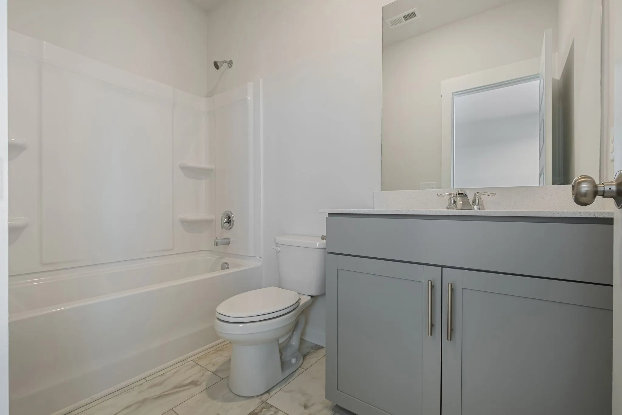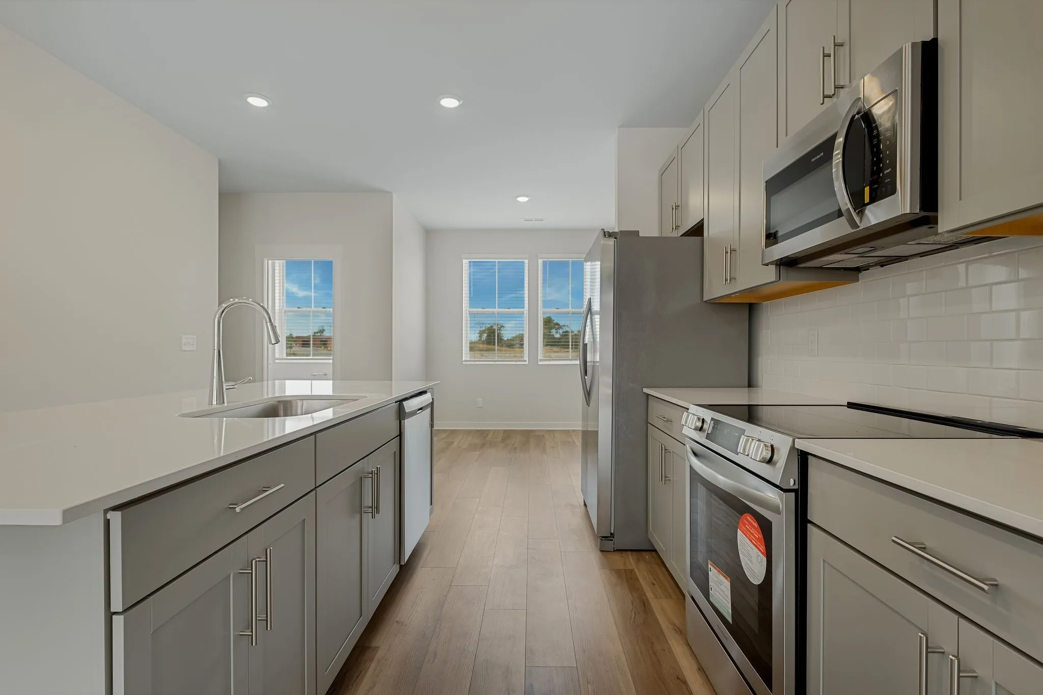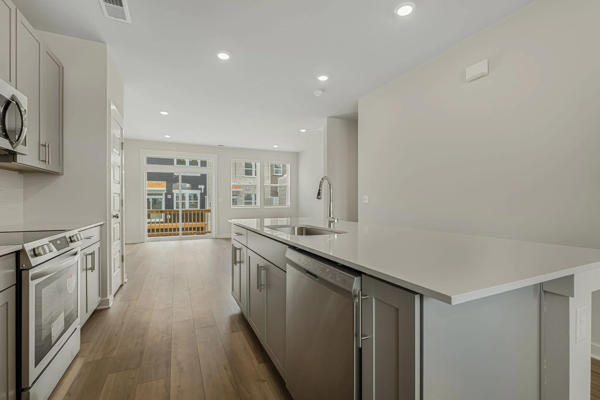 LOT #1050 – Gatlinburg. Upon entry into this new three-story townhome is a convenient two-car garage for storage space. On the second floor is the main living area, featuring an expansive Great Room with direct access to a modern kitchen and dining area. Residing on the top level are two bedroom suites situated at opposite ends of the home to grant privacy, both of which feature attached bathrooms for enhanced livability.