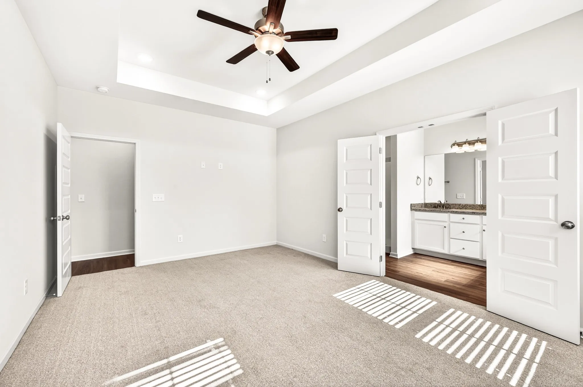The primary suite is tucked privately off its own hallway, featuring a walk-in closet, double granite vanities, a large tile-surround shower, and sleek laminate flooring for a modern, low-maintenance feel. Three additional bedrooms share a full bath with granite vanity and tiled tub/shower combo.