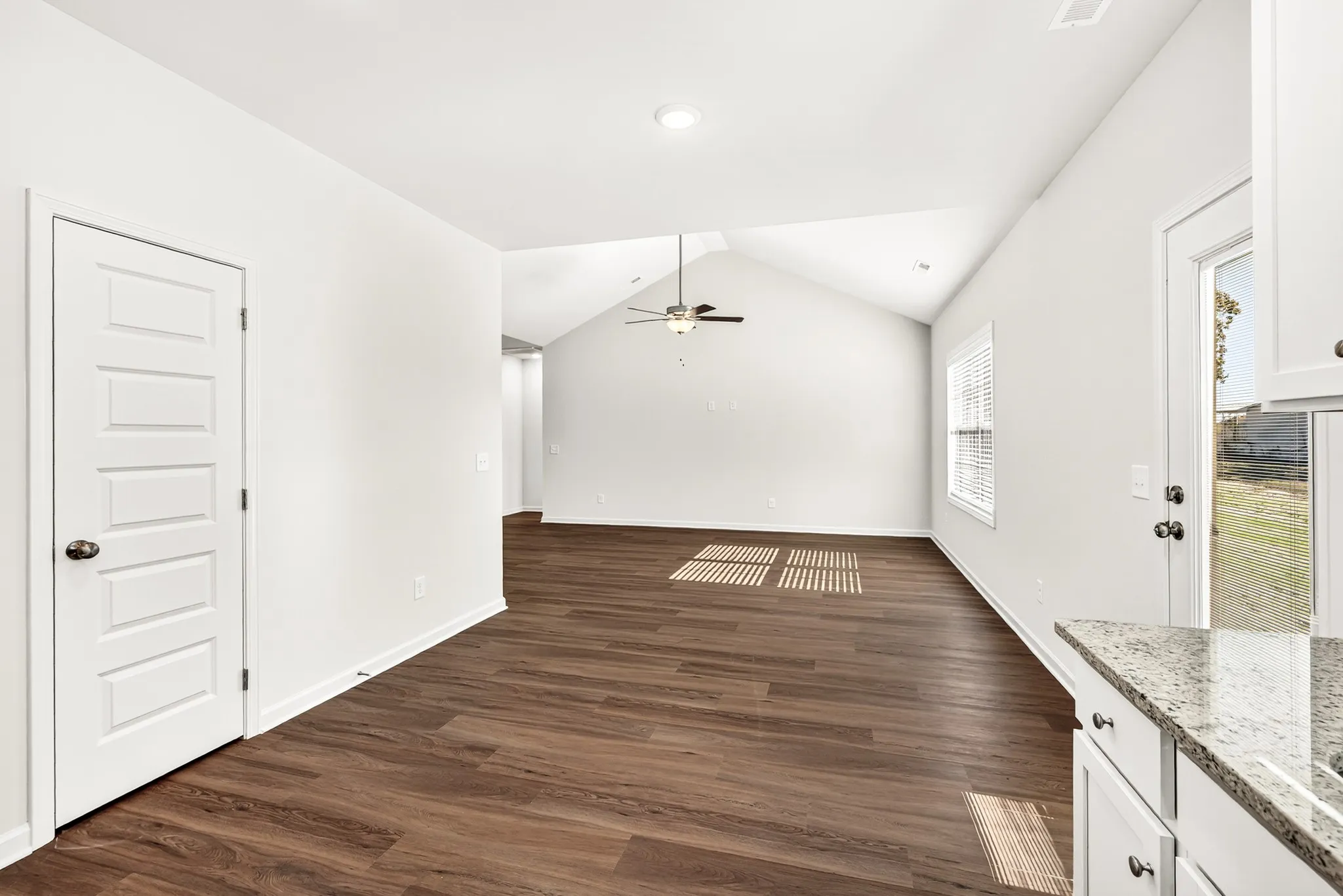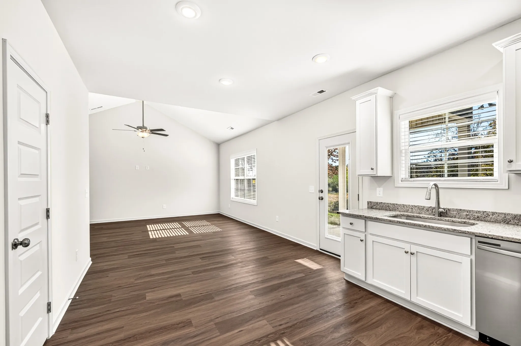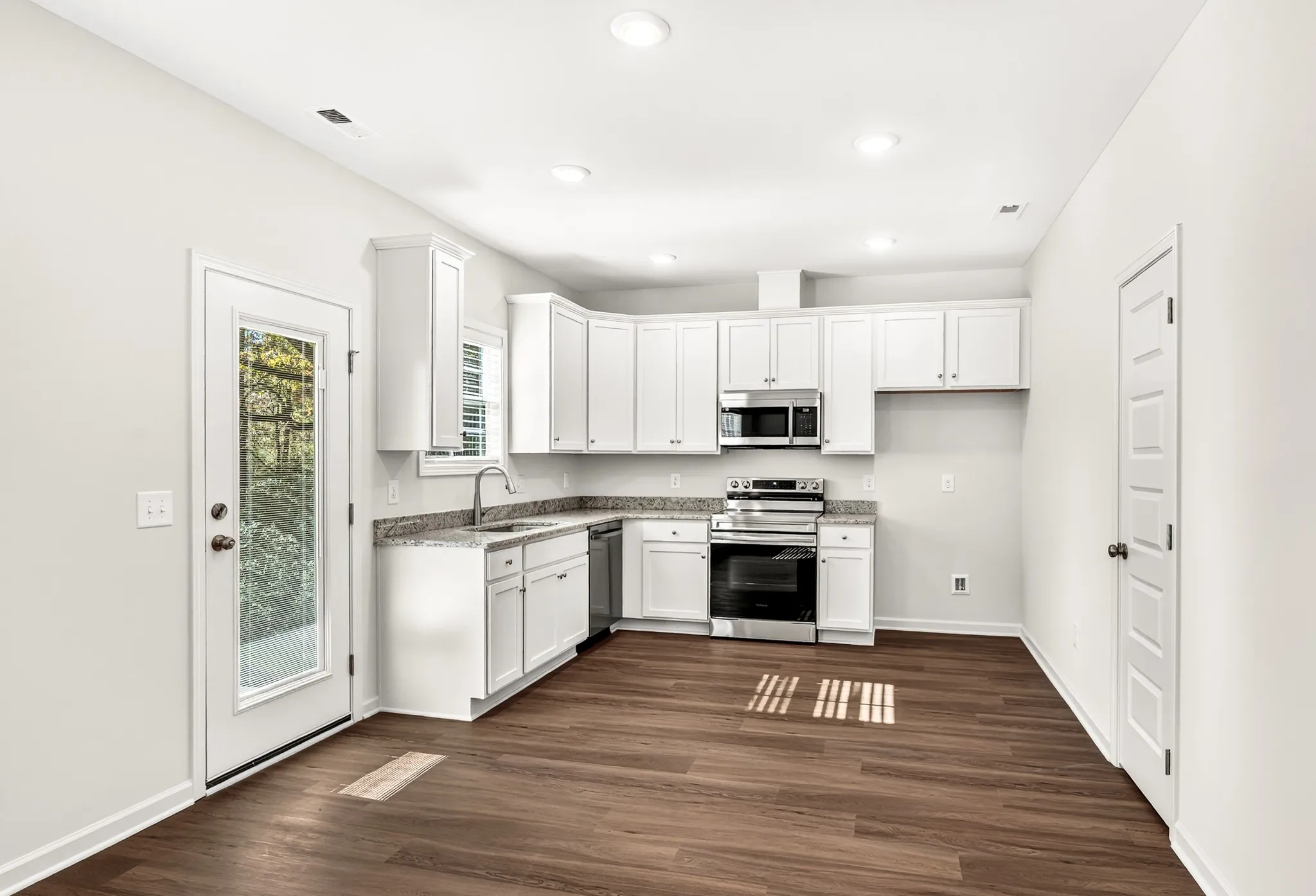 The kitchen is a standout — granite countertops, undermount sink, brand-new Samsung appliances, recessed lighting, and direct access to the covered rear porch for effortless entertaining or quiet evenings outdoors. (The backyard provides plenty of space to add fencing, privacy screening, or landscaping to make it your own.)