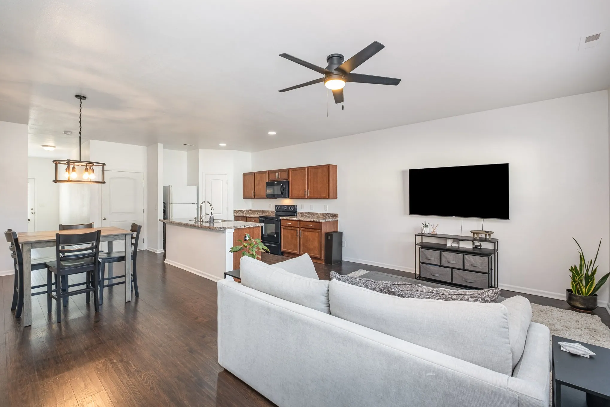 This spacious 3-bedroom townhome with a freshly painted interior, updated light fixtures, and modern LED ceiling fans throughout! The open-concept main level is perfect for both everyday living and entertaining, featuring a kitchen with abundant cabinet space, a custom built-in pantry, and a large island ideal for meal prep. Upstairs, you’ll find an oversized owner’s suite along with two generous secondary bedrooms — a rare find in most townhomes! Enjoy a brand-new fenced-in yard, perfect for outdoor relaxation or pets. All appliances remain, including the washer and dryer. The home also includes a convenient garage that can be controlled with a mobile app, making this townhome move-in ready. Don’t miss it!