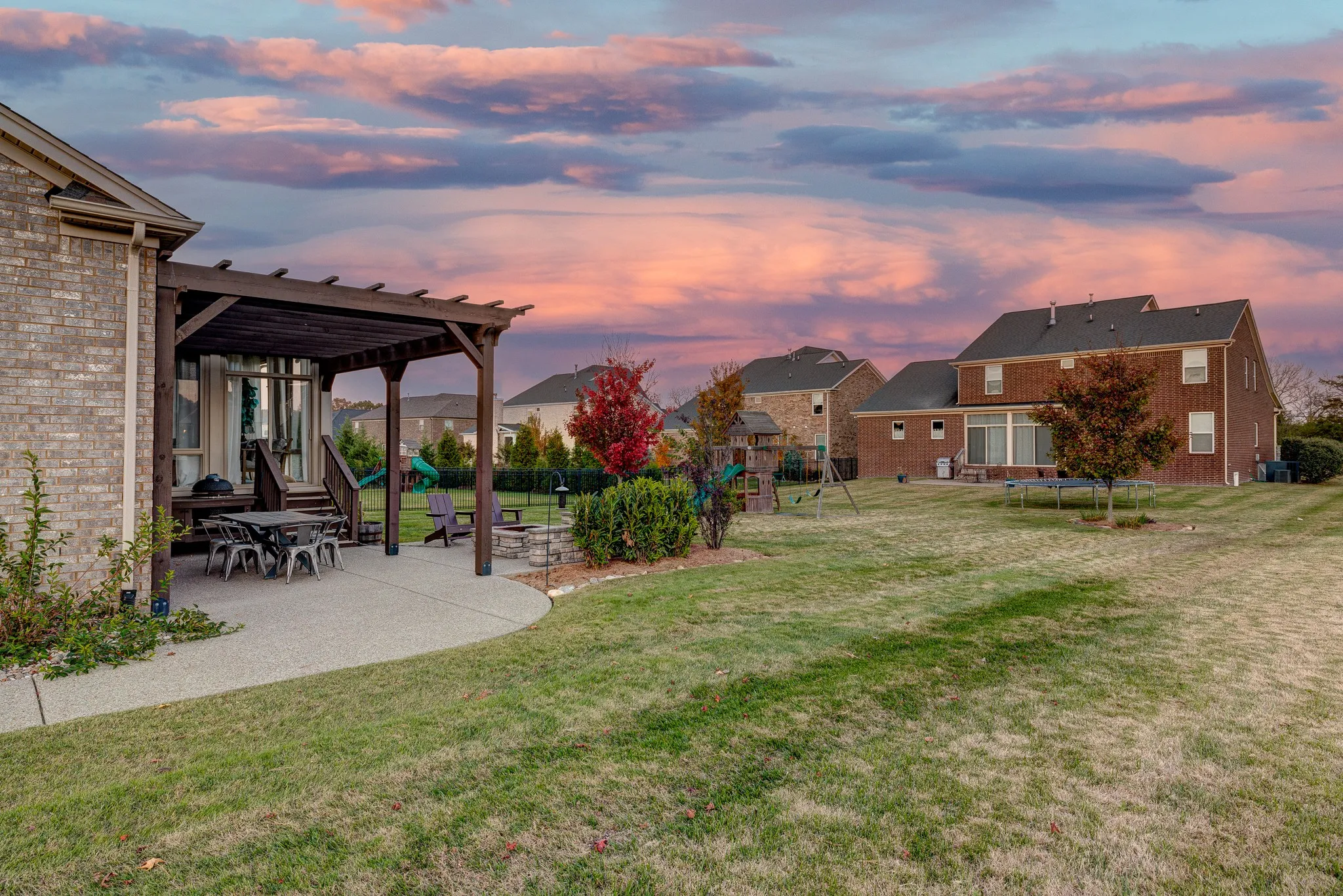 Outside, entertain under the attached pergola, cozy up around the built-in fire pit, and let everyone play on the flat backyard. The corner-lot setting adds breathing room with open space to the right side.