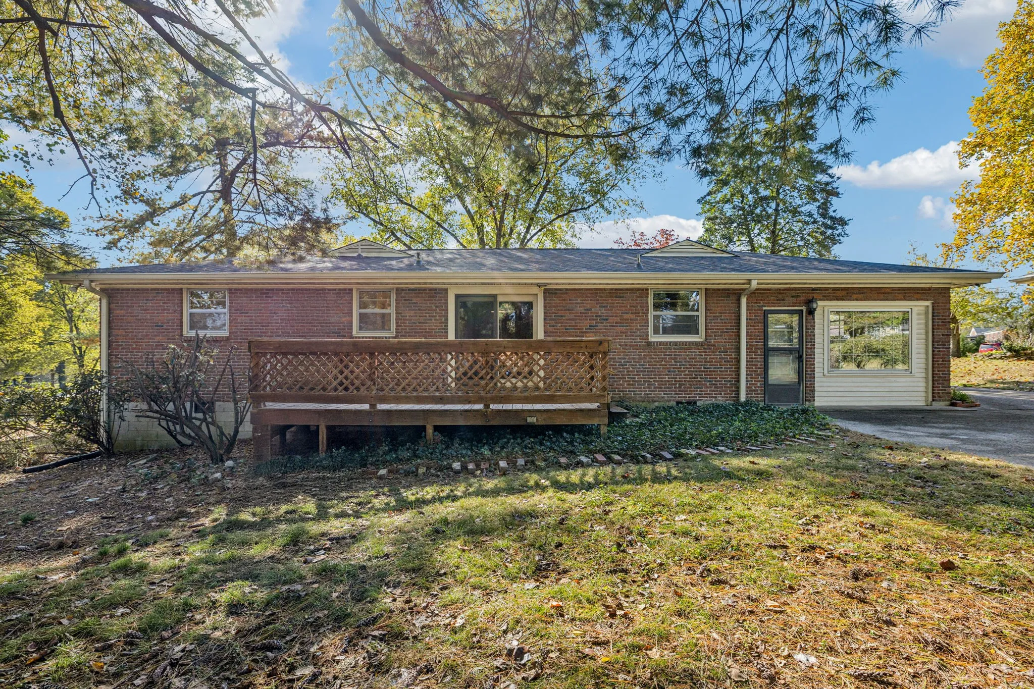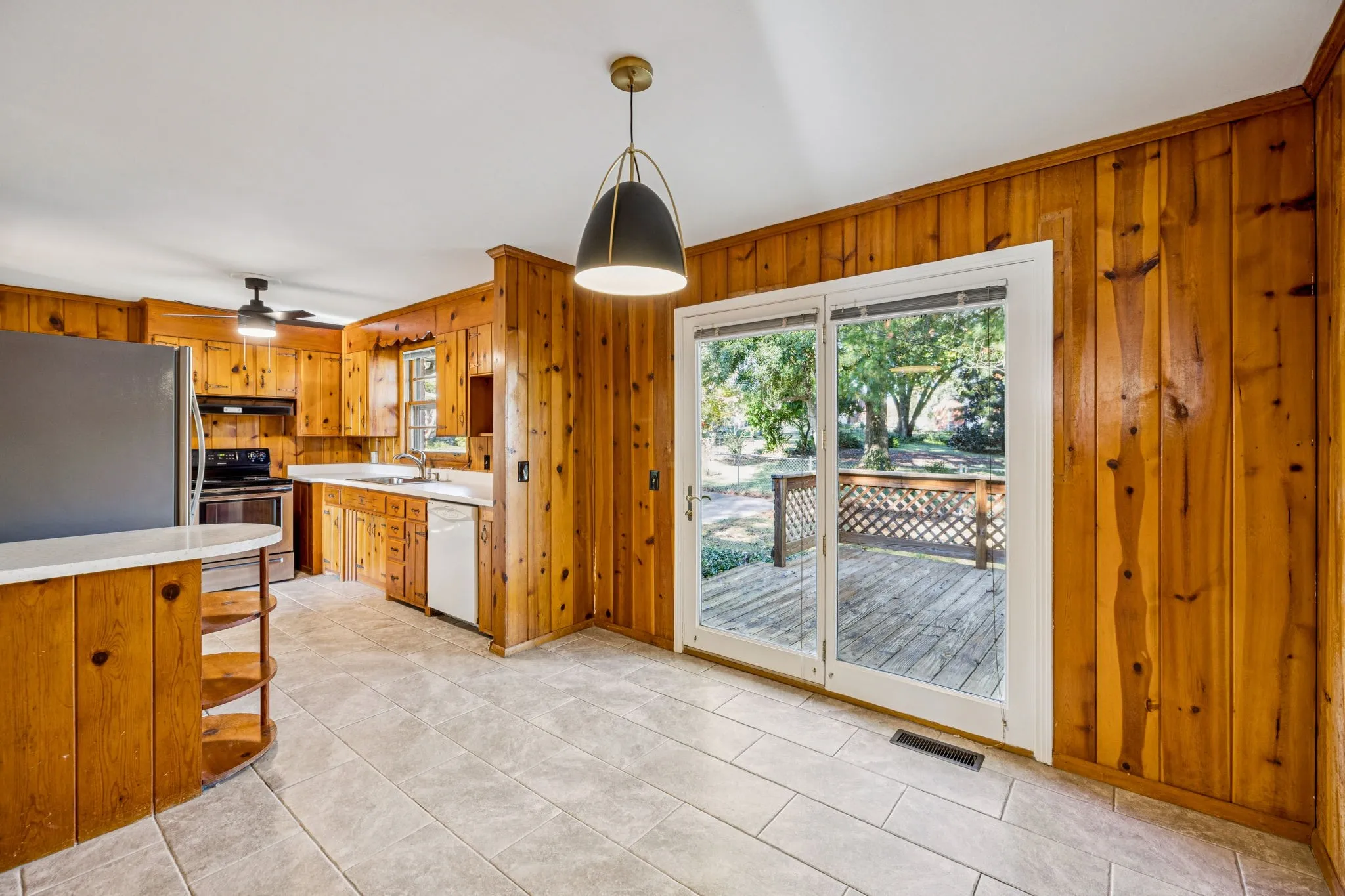 Sunny and sharp mid-century ranch! Single(level) and ready to mingle! It’s time for your SouthNash Era! Freshly painted interior, original tongue-and-groove oak floors, vintage bath tile, modern lighting throughout. You love the knotty pine?! Well look no further, this cool kitchen and dining room have got you wrapped up in it! Step out back to unwind on the expansive deck. Your leafy, large, level rear yard is fully-fenced with a nice barn shed for your yard gear, kayaks, frisbees, and whatnot. Think it can’t get better? Wrong! Pizza Hut AND Prince’s Hot Chicken are so, so close! C,mon, Live the dream!