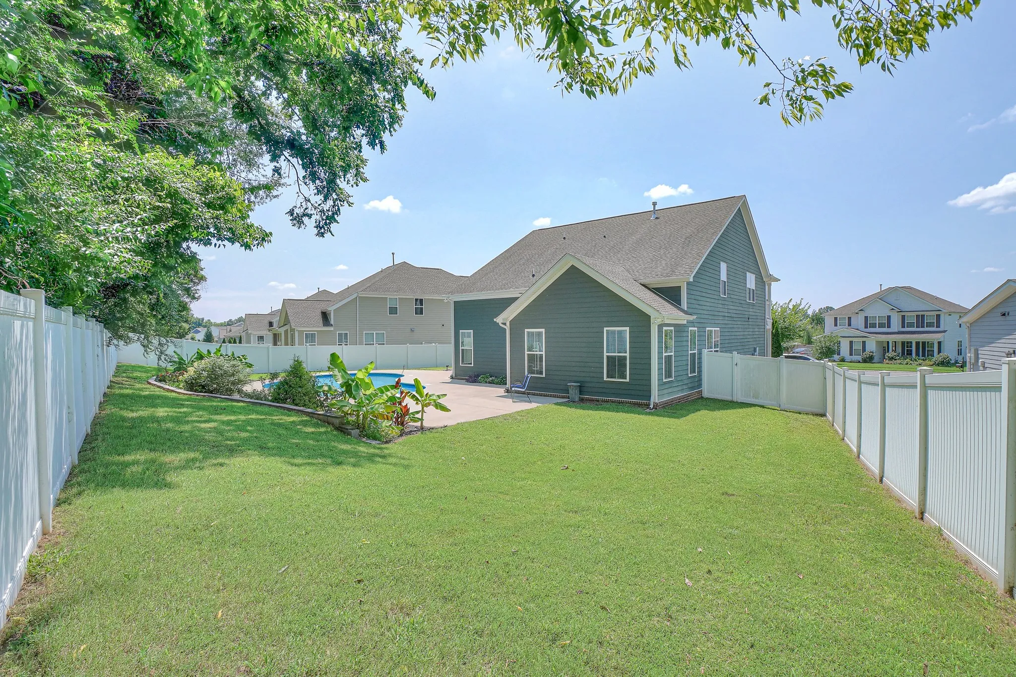 Outside, your private backyard oasis awaits with a tree-lined view, in-ground pool, and space for a fire pit, patio, grill, or garden—ideal for gatherings or quiet relaxation.