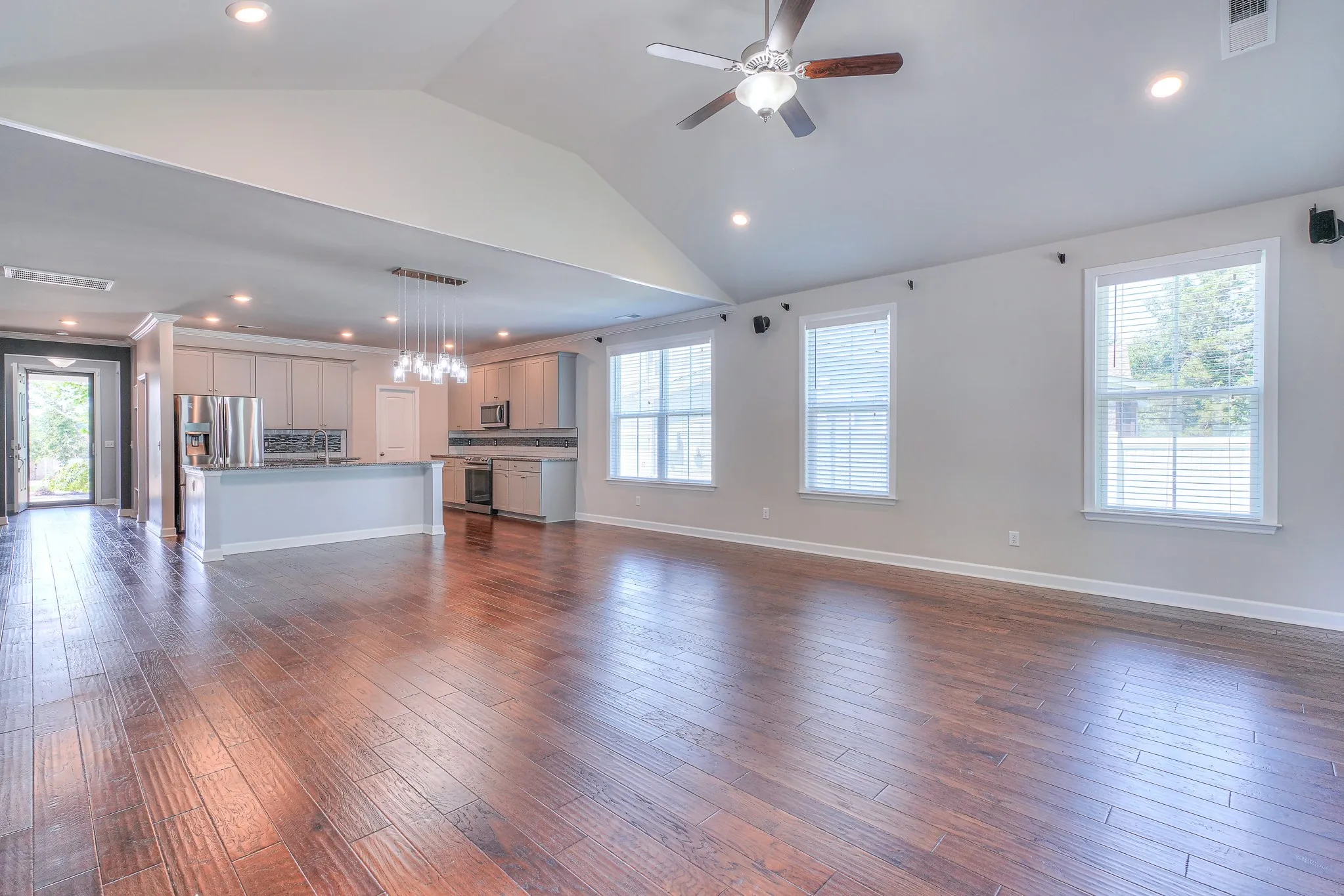 Step inside to an open-concept floor plan where the spacious kitchen flows seamlessly into the dining area and living room. Vaulted ceilings, abundant natural light, fresh carpet, new paint throughout, and a freshly painted exterior create an inviting atmosphere that balances modern design with cozy charm.