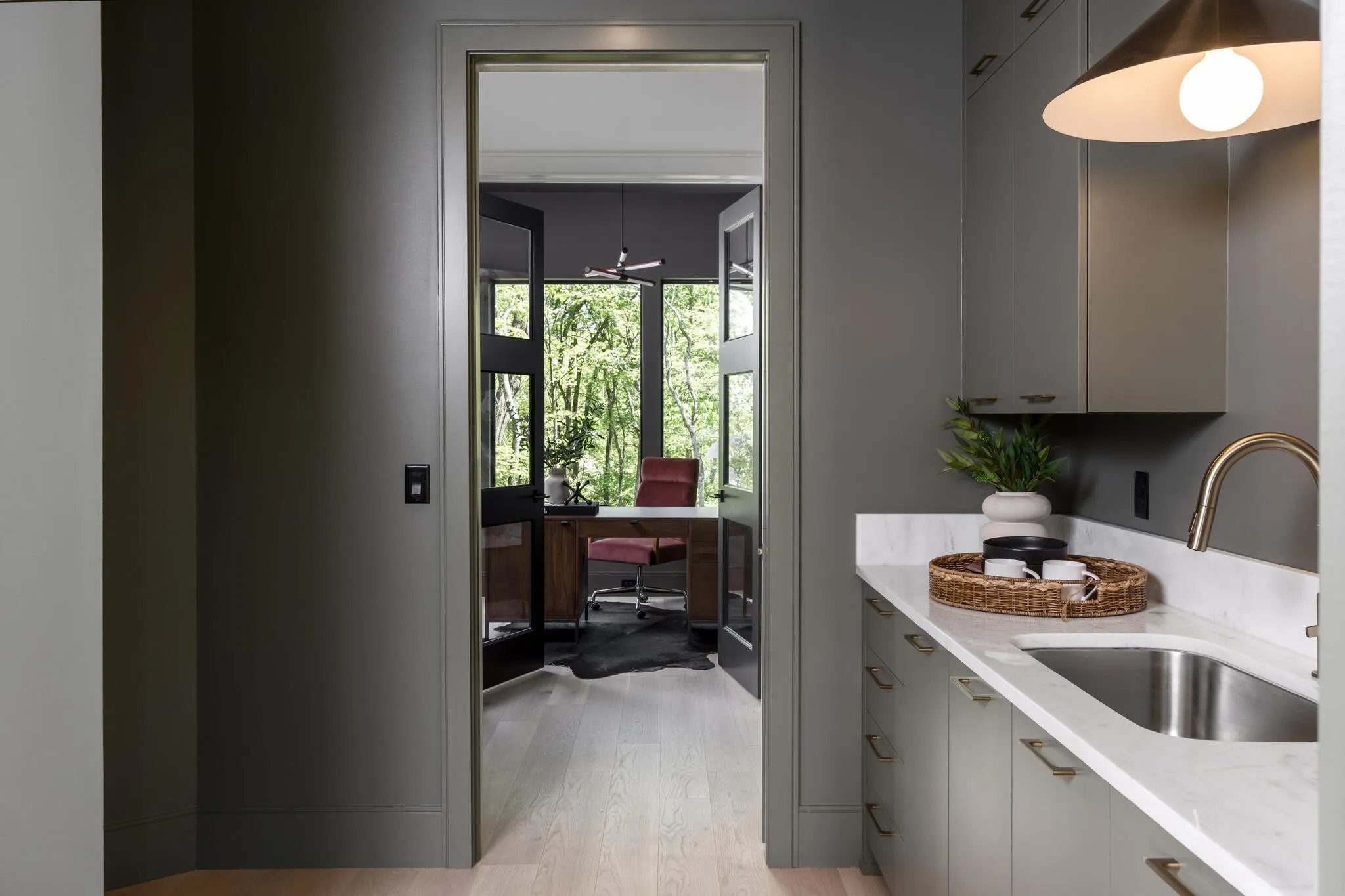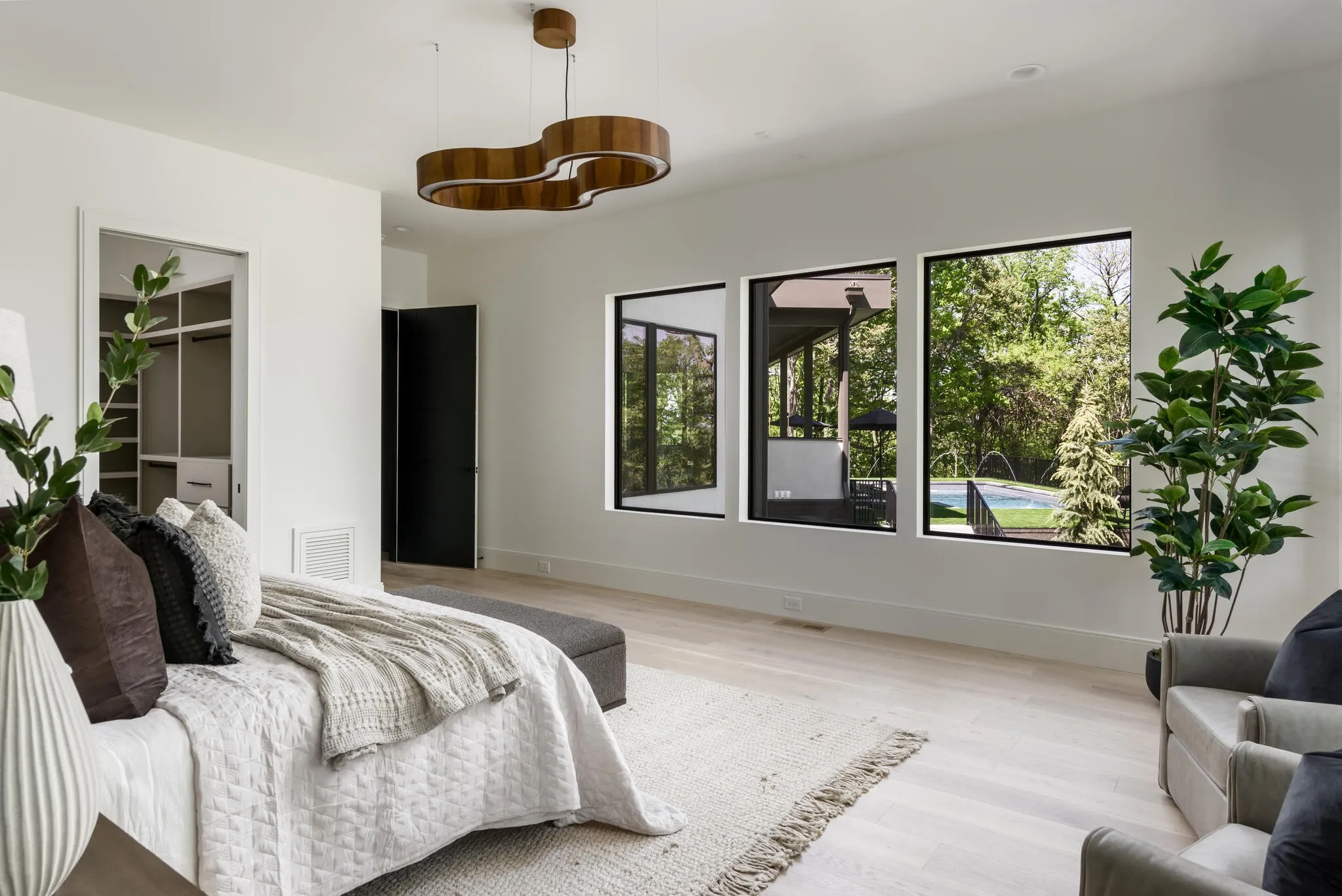 The gourmet kitchen is a true chef’s dream, showcasing custom white oak cabinetry, exquisite quartz surfaces, chef-grade appliances, and a discreet hidden prep kitchen designed for catering, staging, and culinary flow. A private office with patio access offers a luxurious workspace surrounded by peaceful natural vistas. Each of the five bedrooms has been thoughtfully designed as its own retreat, featuring spa-inspired ensuite baths, timeless finishes, and captivating views across the property. Dimensions for the fifth bedroom are 15x18, providing generous space and comfort.\n
