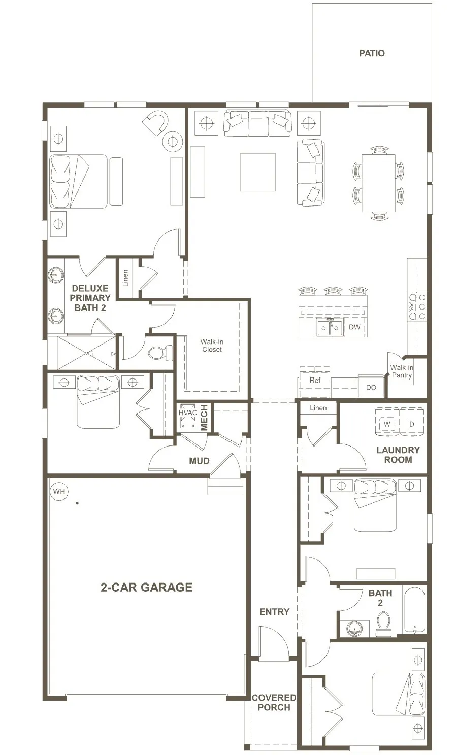 Primary Sanctuary: The Deluxe Primary Suite is privately tucked away at the rear, featuring a large walk-in closet and deluxe bath for a quiet escape.