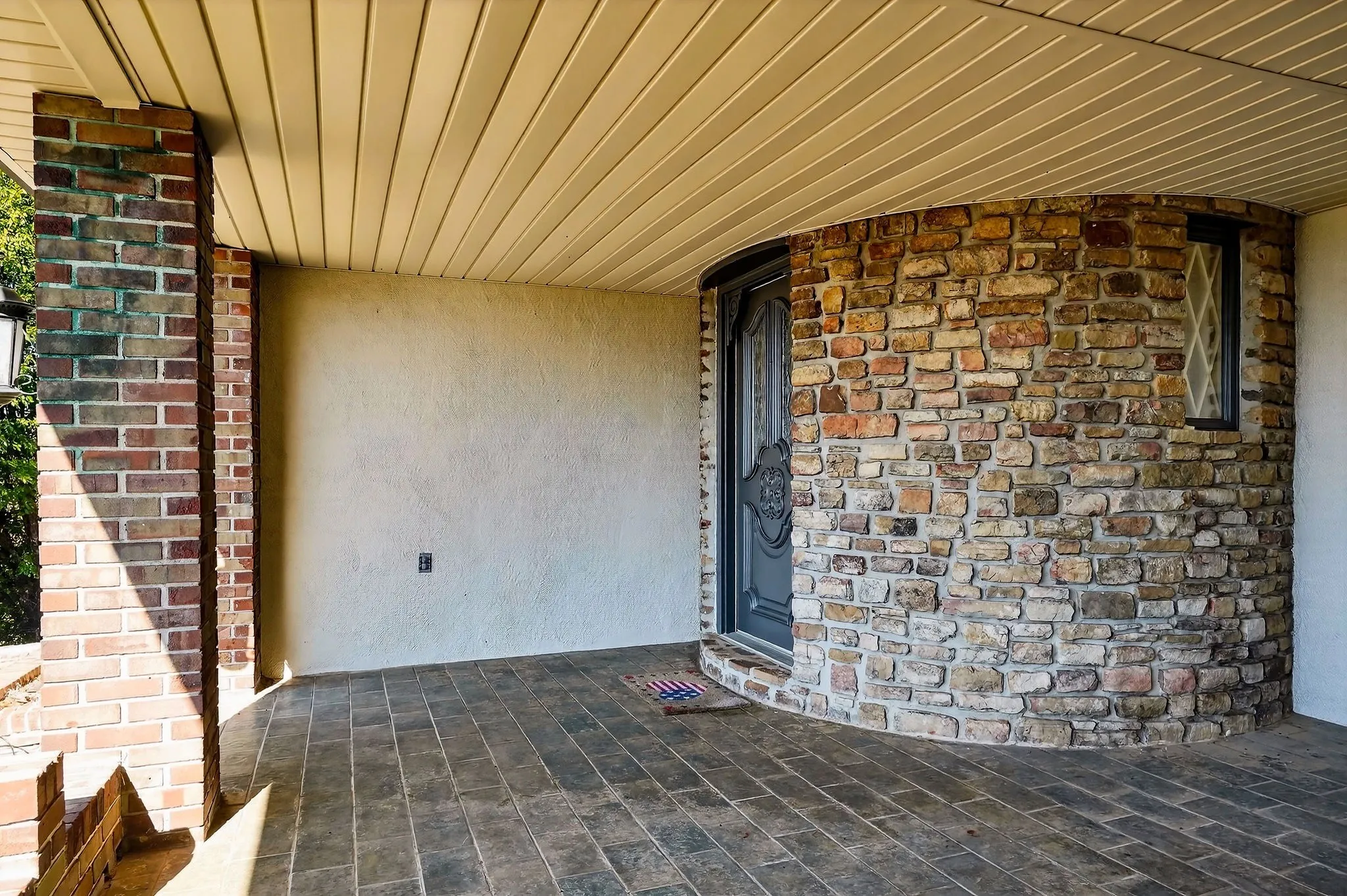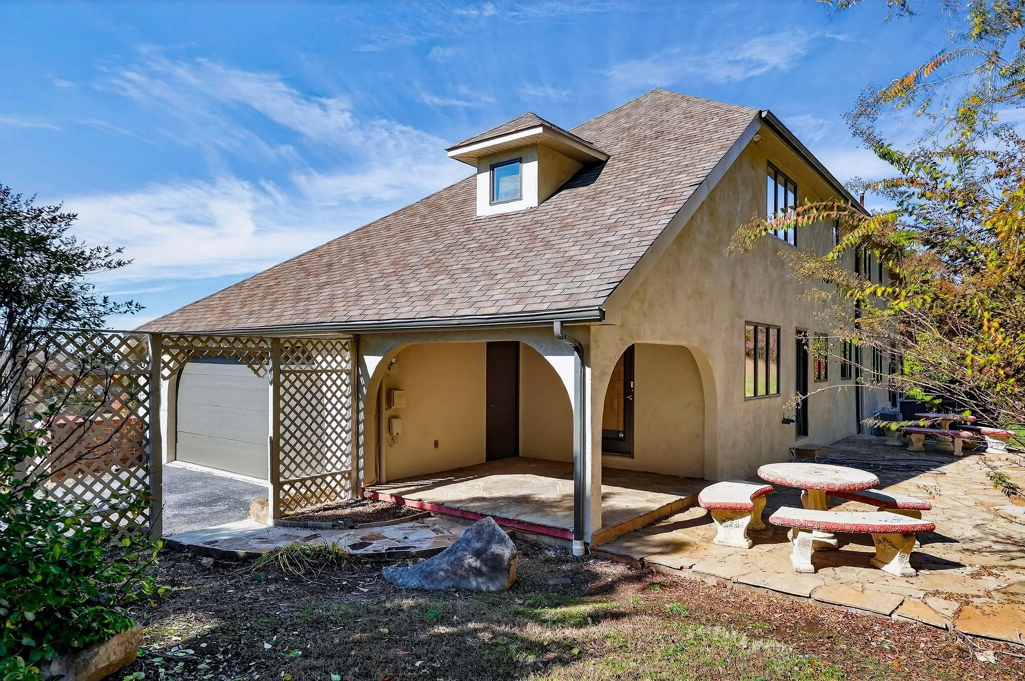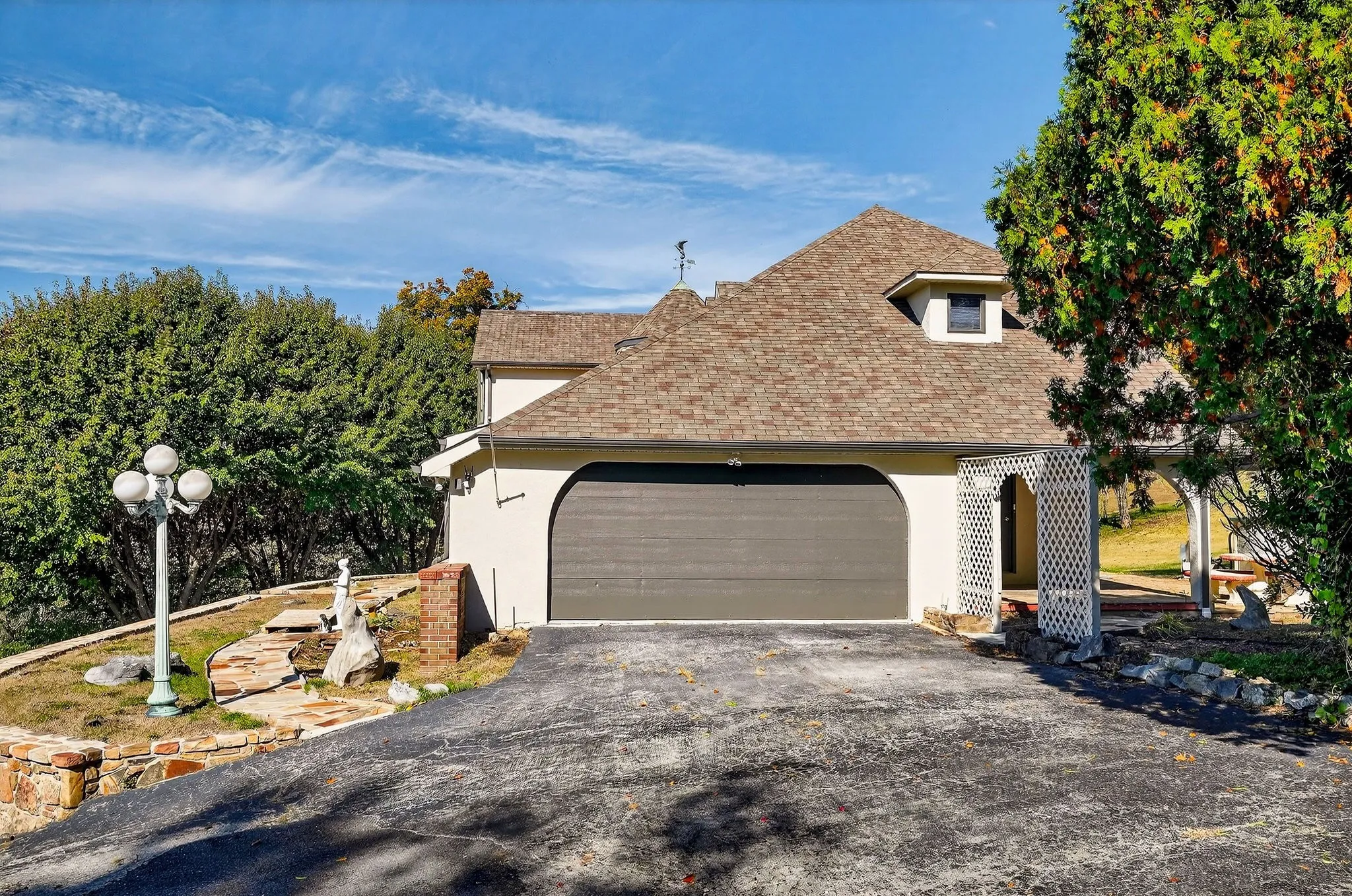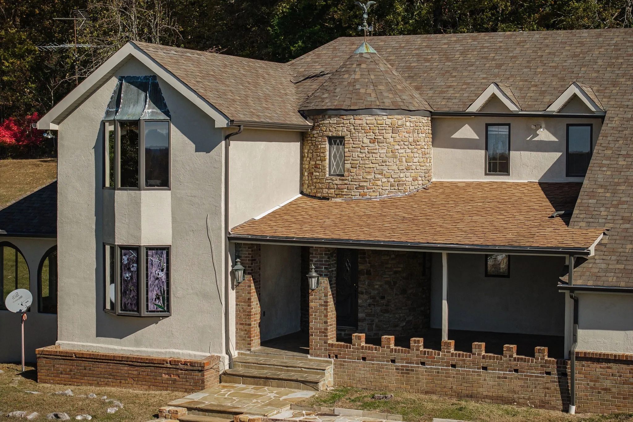 A semi-rounded stone turret creates a striking first impression, complemented by freshly painted stucco and classic stonework. The sweeping driveway, lined with mature Bradford Pear trees, welcomes you home and sets a grand tone. Inside, discover hardwood and Spanish tile flooring throughout much of the main level. The spacious layout features three bedrooms and two and a half baths, including a serene primary suite designed for privacy and relaxation.\n