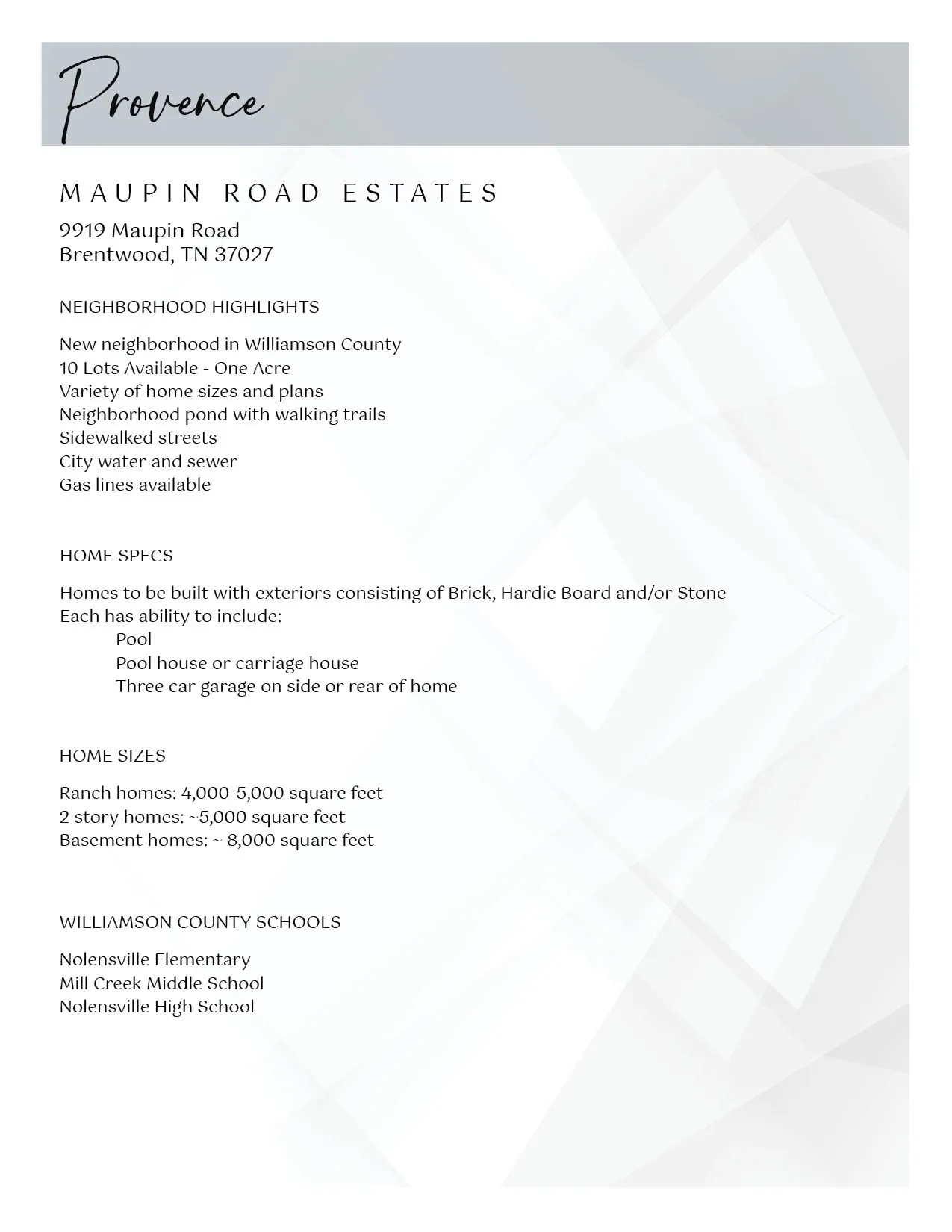 Provence offers ten spacious homesites in the hills of Brentwood, Tennessee. Each lot provides over an acre of space for designing and building your custom home in one of Williamson County’s most desirable locations.