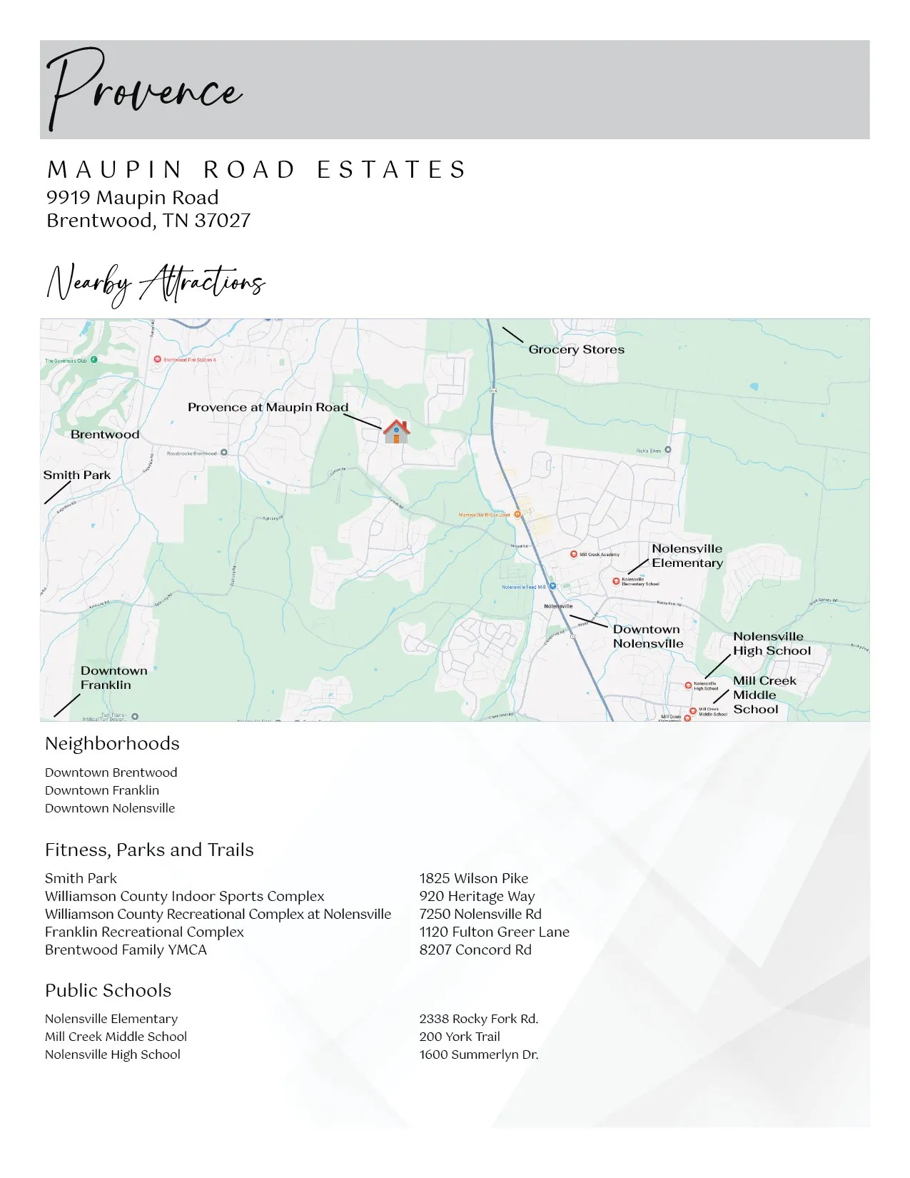 This scenic community sits in the rolling hills of Williamson County, offering natural beauty while maintaining convenient access to Nashville. The location provides prime Brentwood positioning, proximity to shopping and dining, zoned access to Williamson County Schools, quick access to Nashville’s business centers and mature trees with natural surroundings.