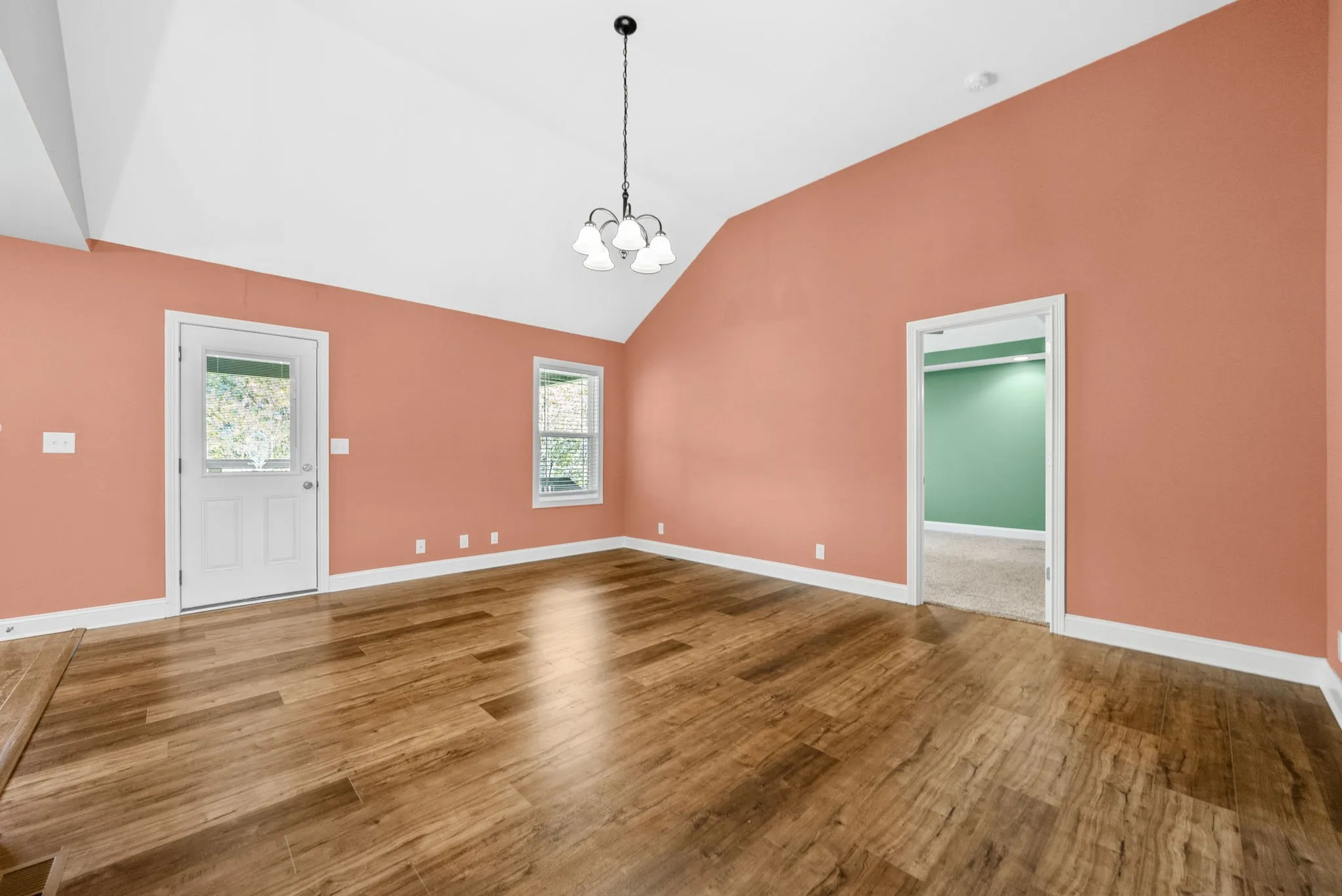 Retreat to the primary suite, highlighted by a vaulted ceiling, plush carpeting, and an en-suite bath with double sinks, a walk-in shower with built-in seating, and refined finishes.