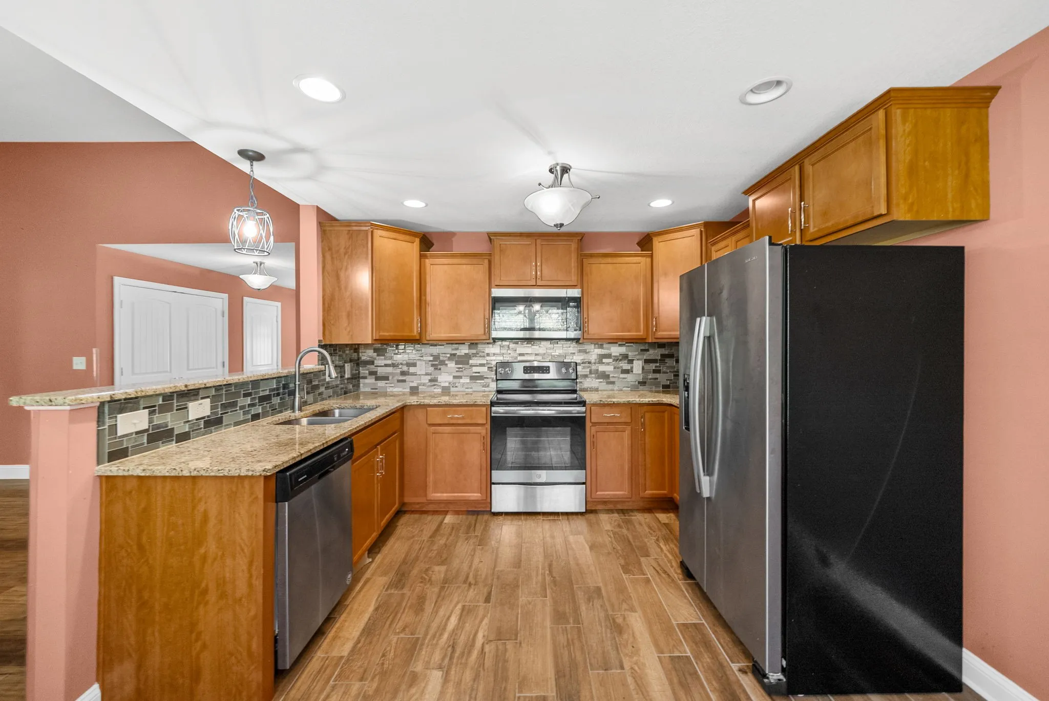 The kitchen showcases marble countertops, a sleek tile backsplash, stainless steel appliances, and plenty of cabinet space for all your essentials.