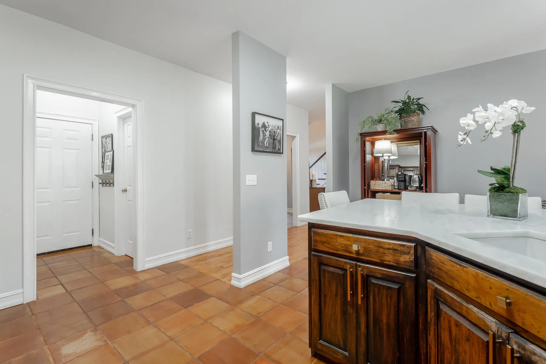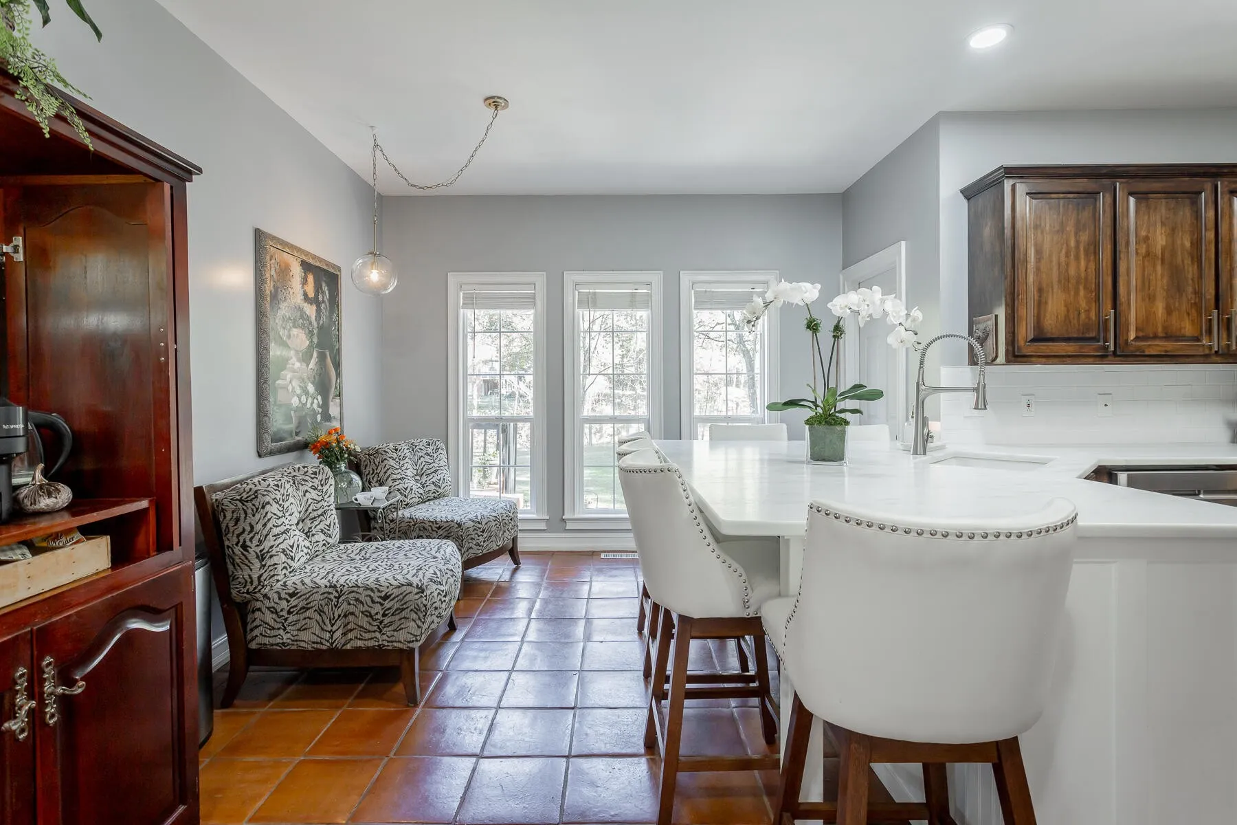 The home’s layout seamlessly connects the living, dining, and kitchen areas making it ideal for both everyday living and entertaining. The updated kitchen features leathered quartzite counters, ample bar seating, stainless steel appliances, and a spacious walk-in pantry. Just adjacent the kitchen is the conveniently located laundry room, half bath, and access to the large 2 car garage.