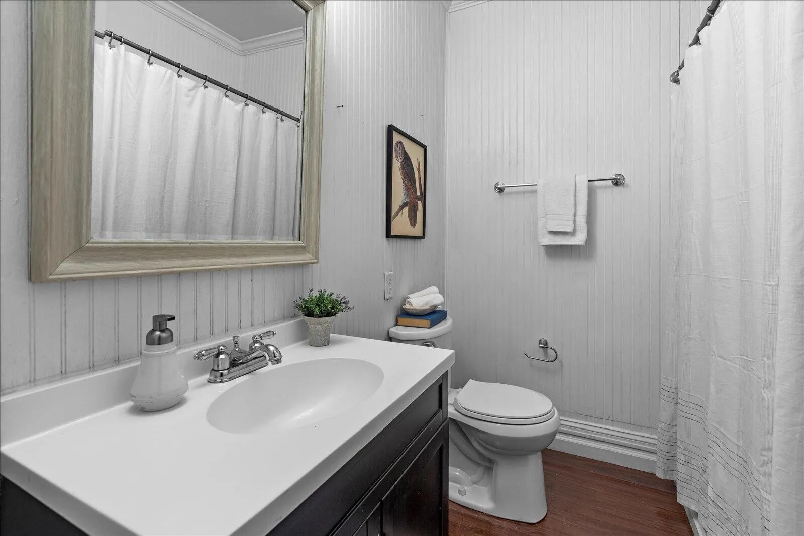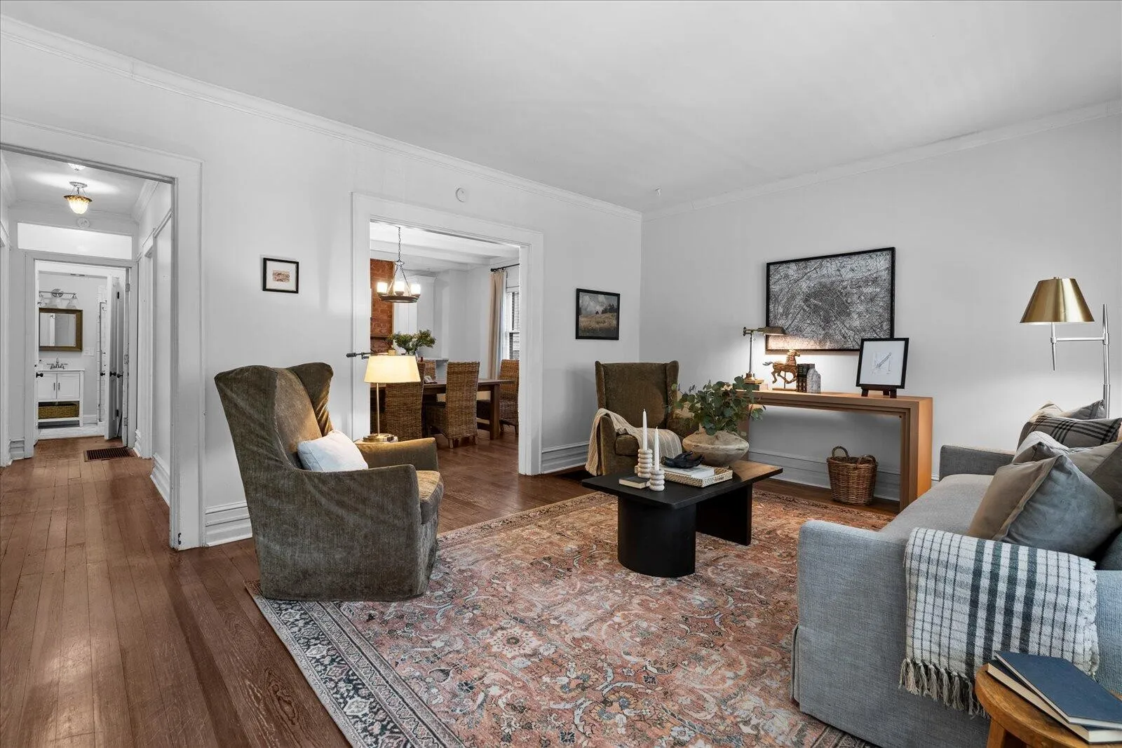 The primary suite offers a private bath with a tiled shower, while two additional bedrooms share a full hall bath. Original details like hardwood floors, crown molding, and high ceilings enhance the home’s character throughout.