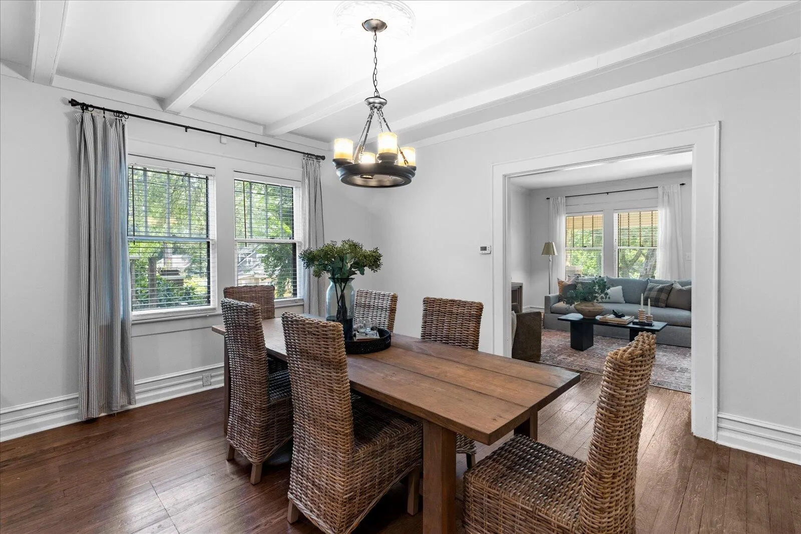 Enjoy scenic Lookout Mountain views from the inviting covered front porch. Inside, you’ll find a spacious living room and a formal dining room with a beamed ceiling and exposed brick fireplace—perfect for gatherings. The kitchen features rich wood cabinetry, granite countertops, and updated appliances.